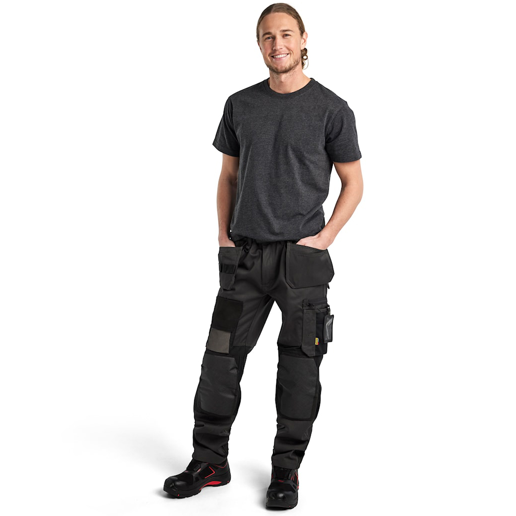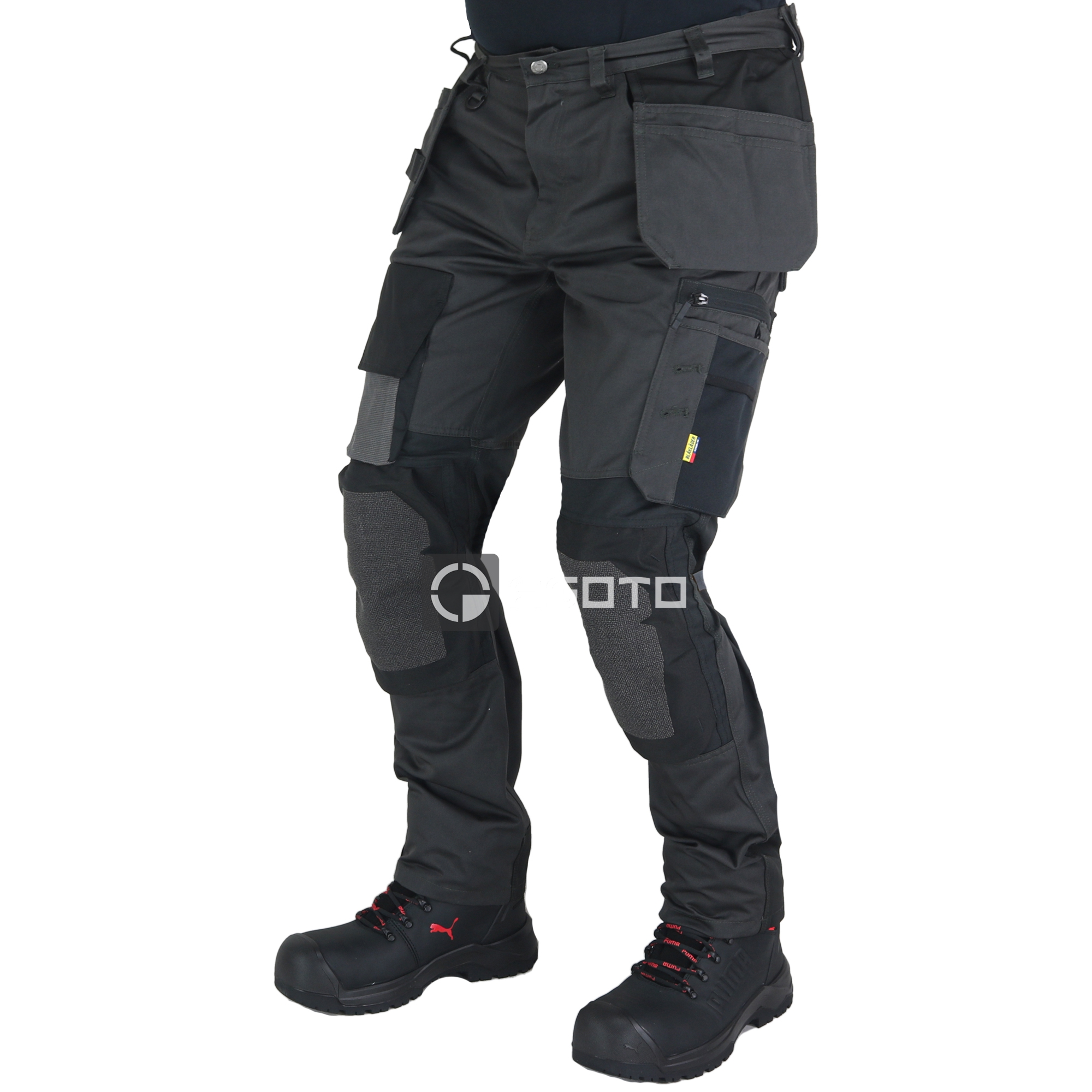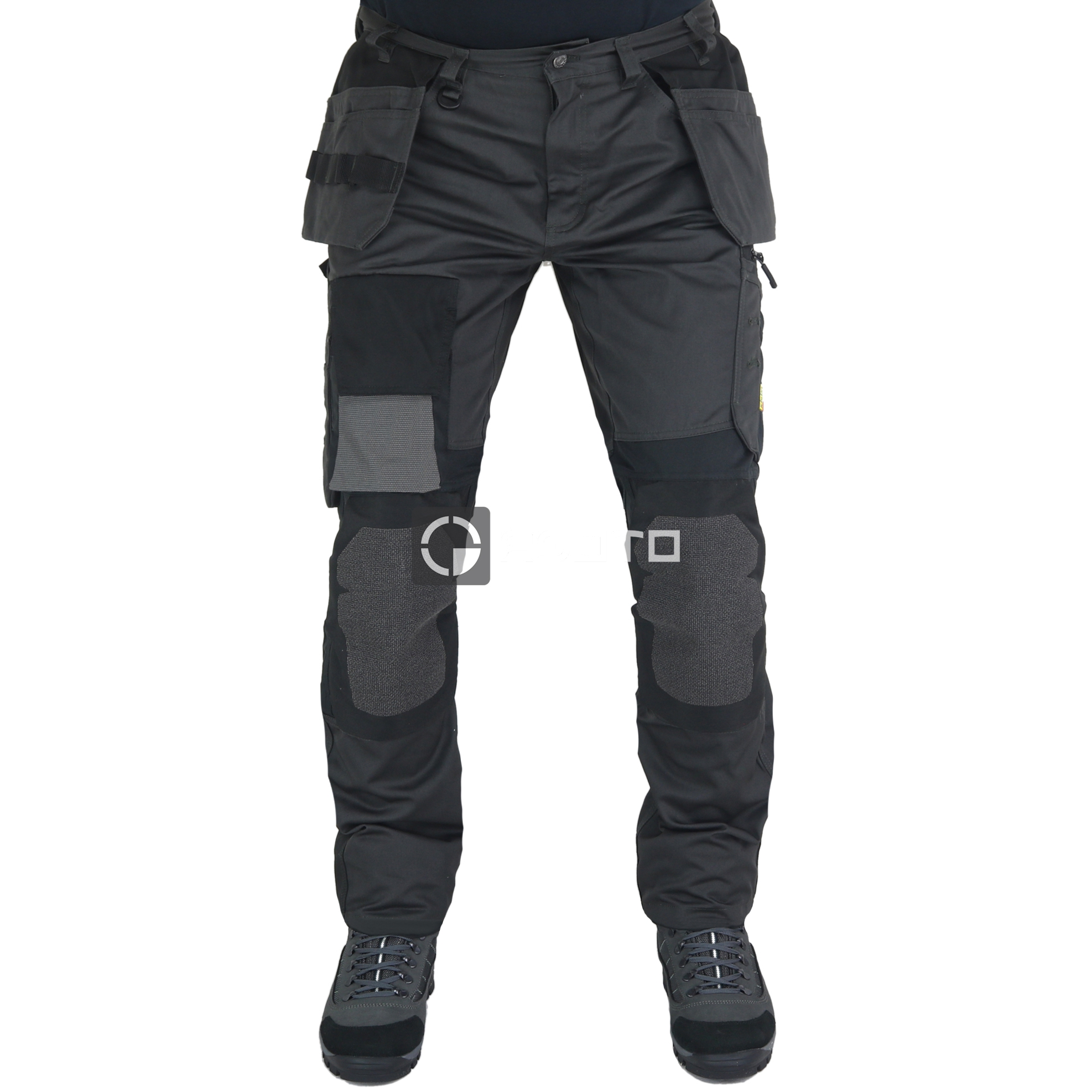 Te eleganckie, elastyczne i wyjątkowo wytrzymałe spodnie rzemieślnicze zostały zaprojektowane z dbałością o każdy szczegół, aby spełniać najwyższe wymagania profesjonalistów dotyczące swobody ruchu, funkcjonalności i komfortu. Połączenie mocnego materiału z elastycznymi wstawkami zapewnia wyjątkową swobodę ruchu, co jest szczególnie przydatne dla parkieciarzy, glazurników i innych rzemieślników często pracujących w pozycji klęczącej. Strategicznie rozmieszczone elastyczne panele na tylnej części, przednich kieszeniach i tylnej stronie kolan maksymalizują zakres ruchu i zwiększają komfort nawet podczas całodziennego użytkowania. Spodnie wyposażono w praktyczne kieszenie, w tym specjalną kieszeń na nóż z materiału wzmocnionego Kevlarem® z klapką i elastycznym panelem oraz elastyczną kieszeń na telefon, która pomieści większość nowoczesnych smartfonów. Dzięki zastosowaniu trwałej mieszanki 65% poliestru i 35% bawełny w splocie skośnym o gramaturze 300 g/m2, spodnie te zapewniają nie tylko długą żywotność, ale także wysoką odporność na trudne warunki pracy. Jako dowód precyzyjnego wykonania i najwyższej jakości producent oferuje dożywotnią gwarancję na szwy, co potwierdza, że te spodnie sprawdzą się nawet w najbardziej wymagających warunkach.