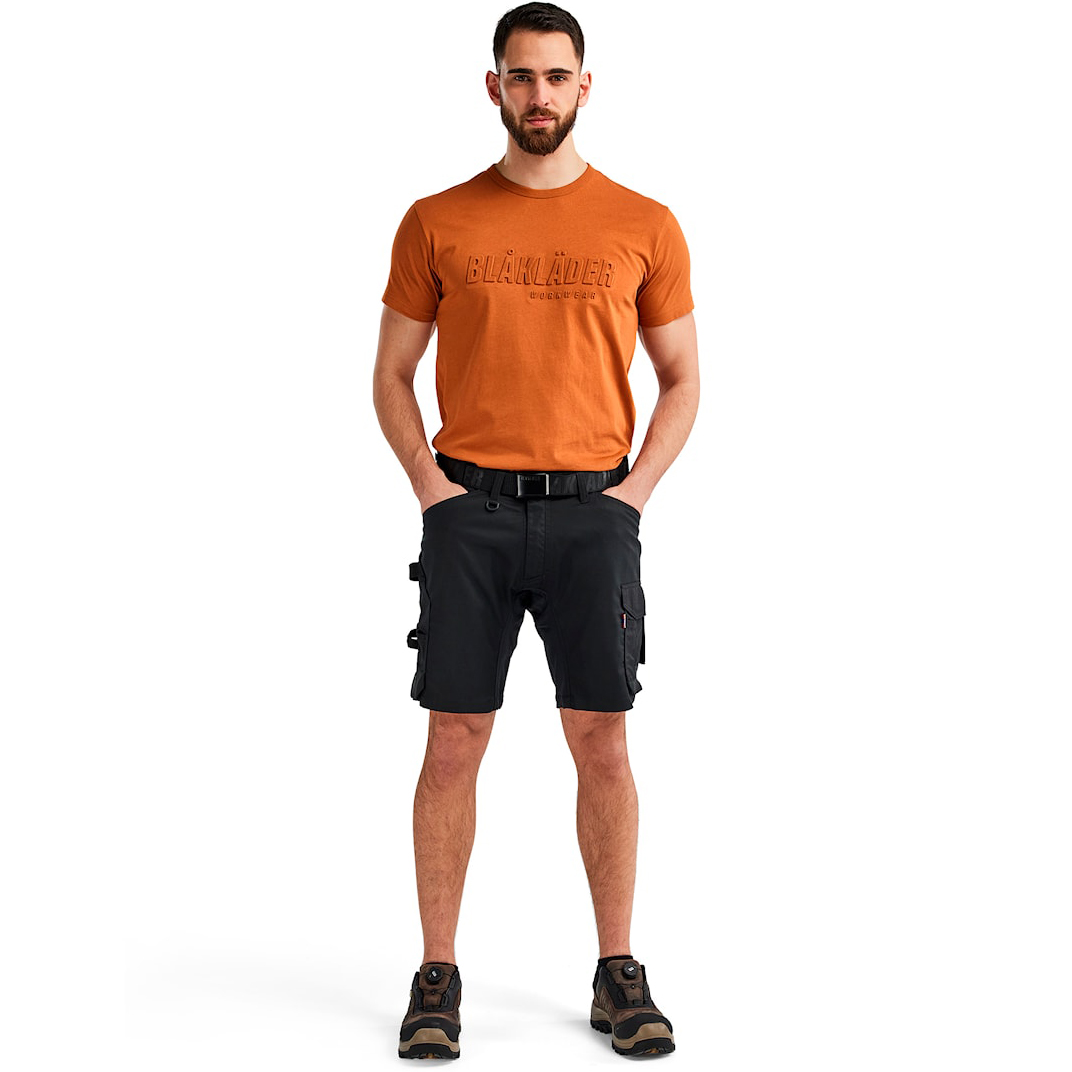 Lekkie i wygodne szorty rzemieślnicze łączące dwukierunkowy materiał stretch z elastycznymi panelami stretch 4D, zapewniającymi maksymalną swobodę ruchów. Praktyczne, wzmocnione kieszenie zwiększają trwałość, w tym kieszeń na miarę i uchwyt na młotek po obu stronach. Metalowe guziki, plastikowy zamek i szerokie szlufki na pasek gwarantują komfort i długą żywotność. Dzięki specjalnej konstrukcji szwów, na które udzielamy dożywotniej gwarancji, nie musisz martwić się o ich przedwczesne zużycie. Elementy odblaskowe na nogawkach poprawiają widoczność. Mieszanka poliestru, bawełny i elastolefinu (245 g/m2) zapewnia idealną równowagę między trwałością a elastycznością.