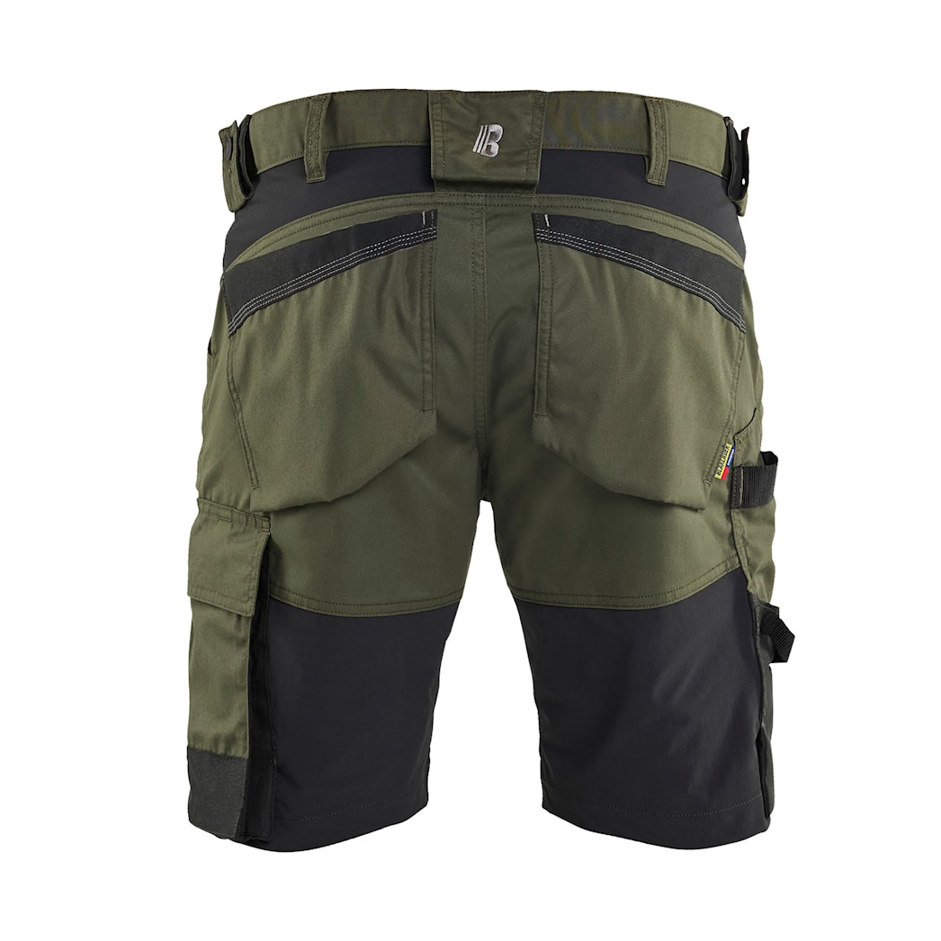 Lekkie i wygodne szorty rzemieślnicze łączące dwukierunkowy materiał stretch z elastycznymi panelami stretch 4D, zapewniającymi maksymalną swobodę ruchów. Praktyczne, wzmocnione kieszenie zwiększają trwałość, w tym kieszeń na miarę i uchwyt na młotek po obu stronach. Metalowe guziki, plastikowy zamek i szerokie szlufki na pasek gwarantują komfort i długą żywotność. Dzięki specjalnej konstrukcji szwów, na które udzielamy dożywotniej gwarancji, nie musisz martwić się o ich przedwczesne zużycie. Elementy odblaskowe na nogawkach poprawiają widoczność. Mieszanka poliestru, bawełny i elastolefinu (245 g/m2) zapewnia idealną równowagę między trwałością a elastycznością.