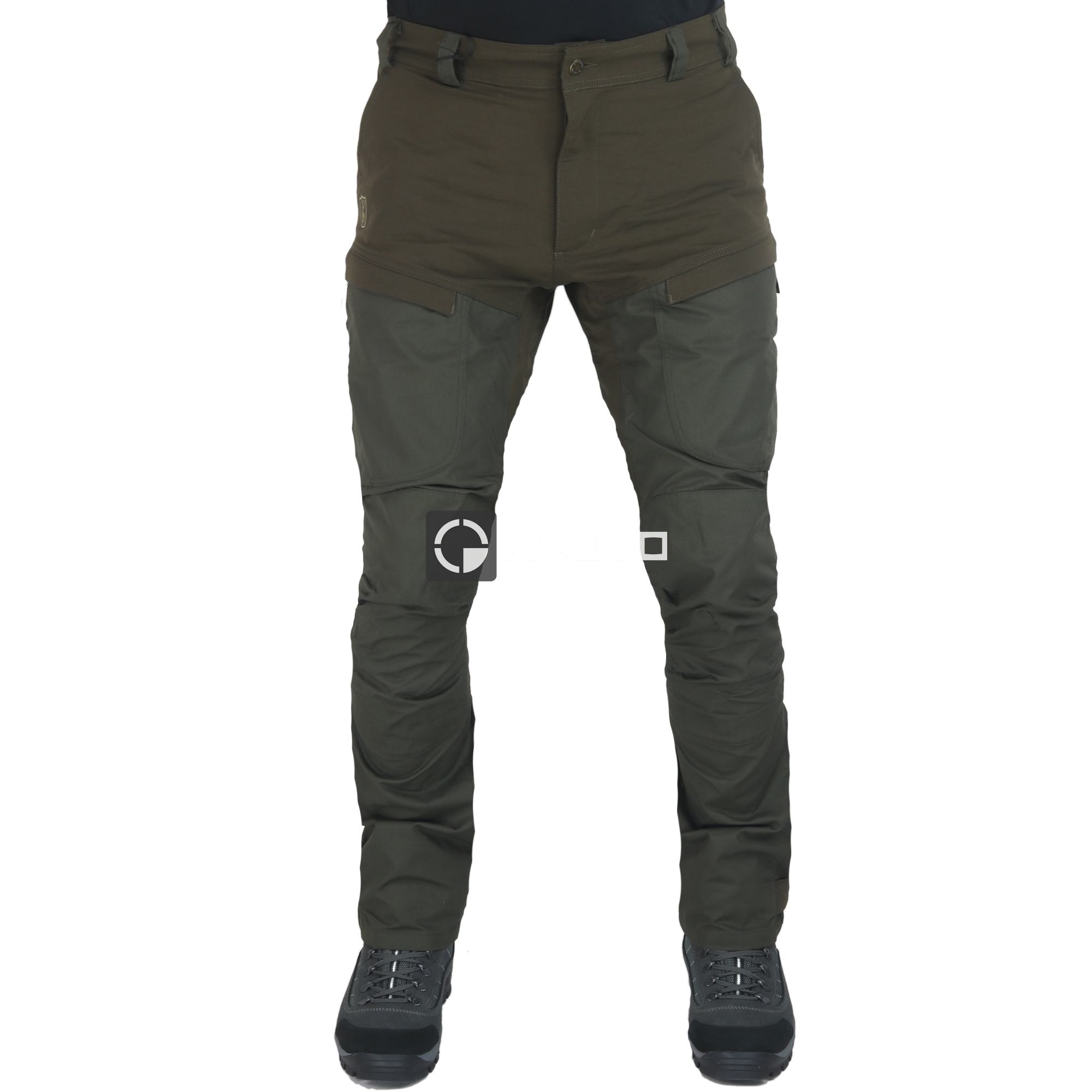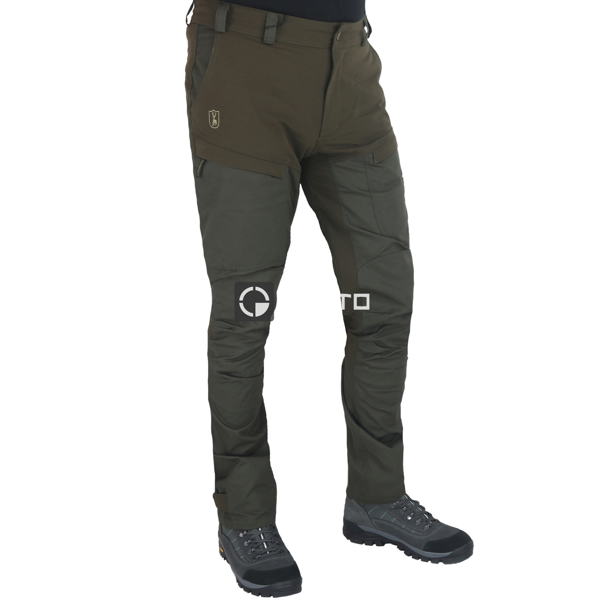 Stworzony dla aktywnego myśliwego i entuzjasty outdooru; noszenie codziennych rzeczy nigdy nie było łatwiejsze dzięki dwóm zintegrowanym kieszeniom przednim, kieszeni na udzie z zakładkami i ukrytemu suwakowi, które zapewniają dodatkową ochronę Twojego sprzętu. Dzięki dodatkowym obszarom rozciągającym się w 4 kierunkach i wstępnie ukształtowanym kolanom spodnie te zapewniają maksymalną elastyczność i większą swobodę ruchów. Spodnie mają ładny design i wygodny krój, elastyczną talię i regulowaną kostkę za pomocą paska i rzepa. Spodnie posiadają wodoodporną powłokę DWR.