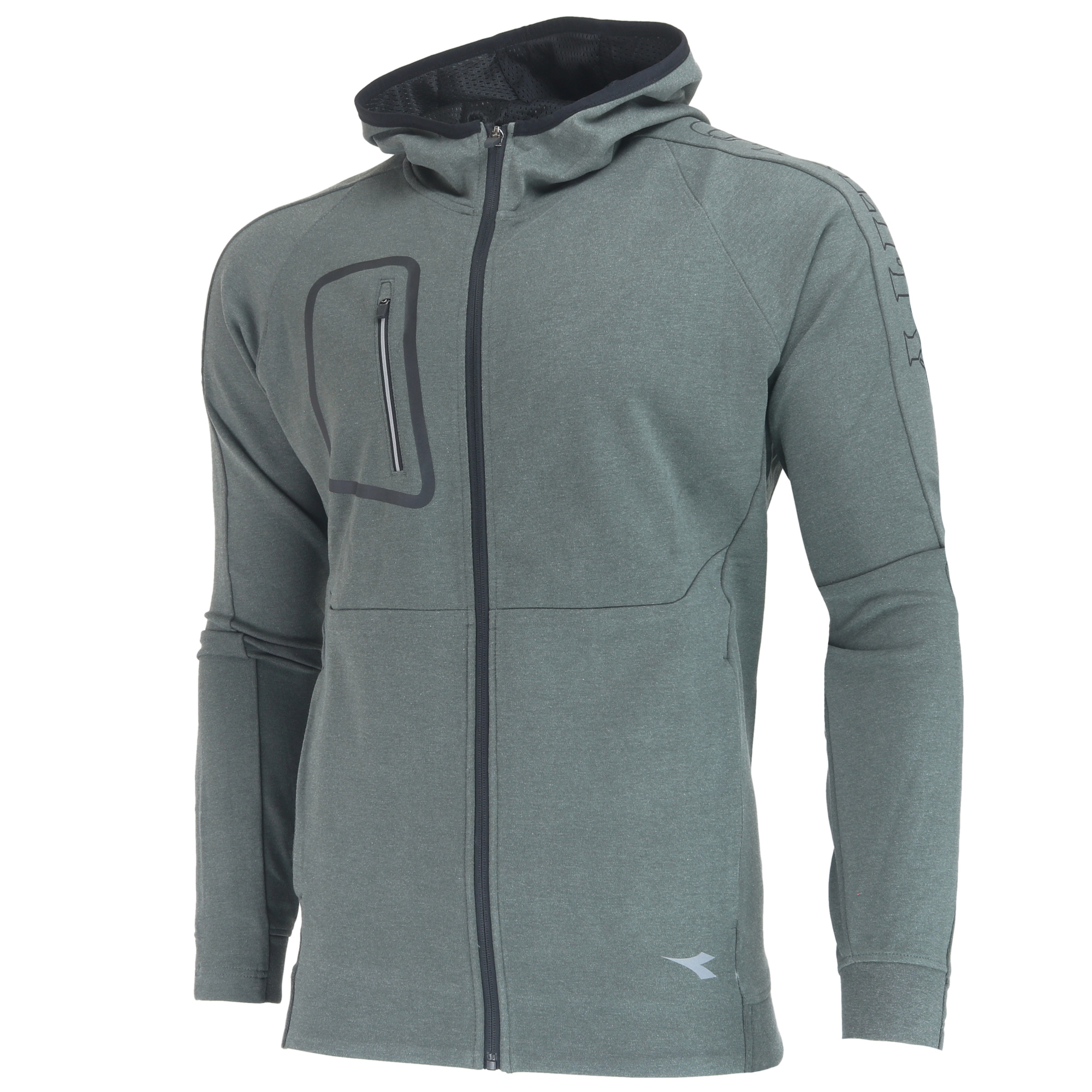 Nieczesana bluza zapinana na zamek, ze stałym kapturem i podszewką z siateczki. Kieszeń na piersi zapinana na zamek oraz dwie kieszenie boczne zapinane na ukryty zamek. Częściowo ściągaczowe mankiety i dół. Ergonomiczny rękaw z plisowanym łokciem. Odblaskowe detale i samoblokujący ściągacz zamka krzywkowego. Interlock 55% Bawełna, 37% Poliester, 8% Elastan, 350 gr/m2