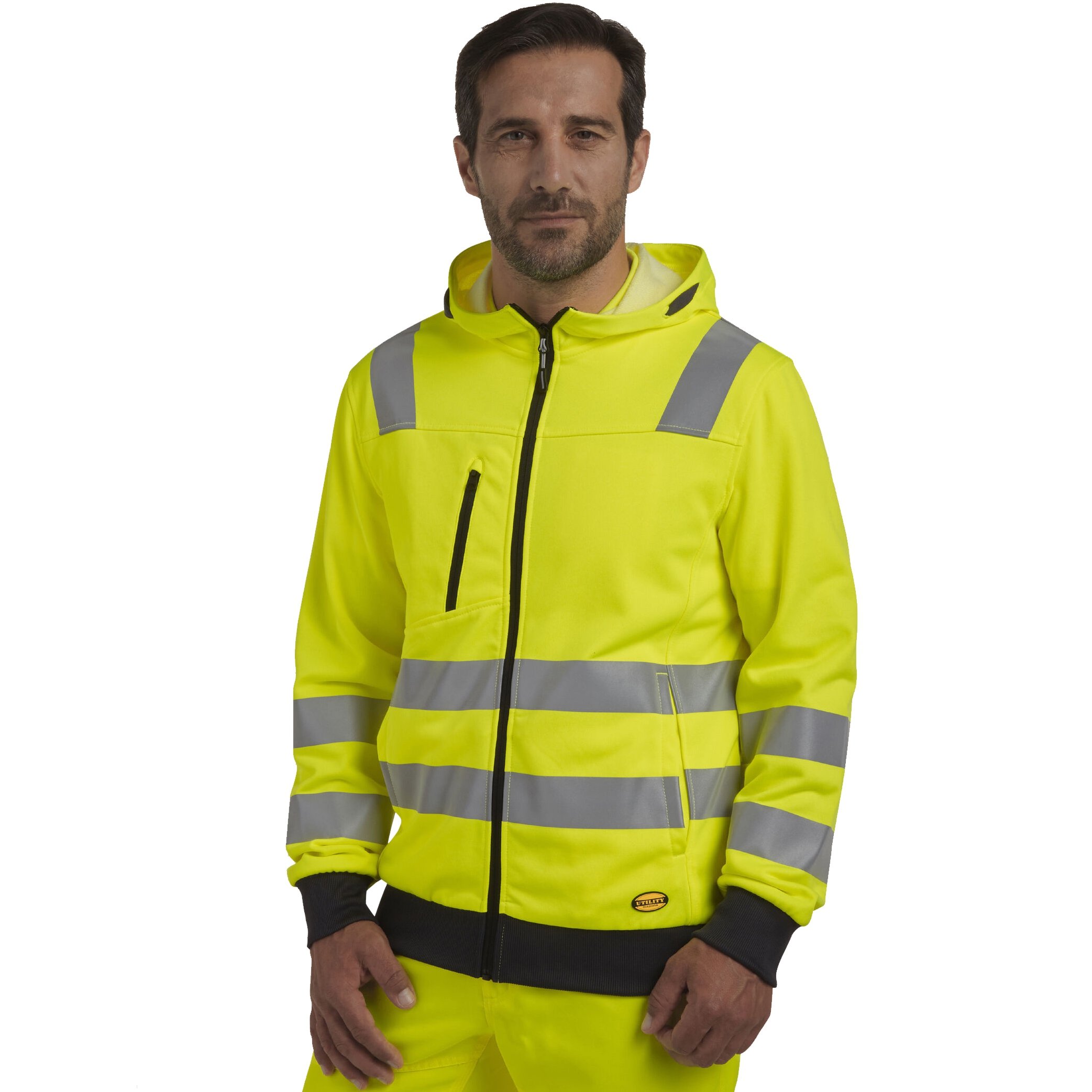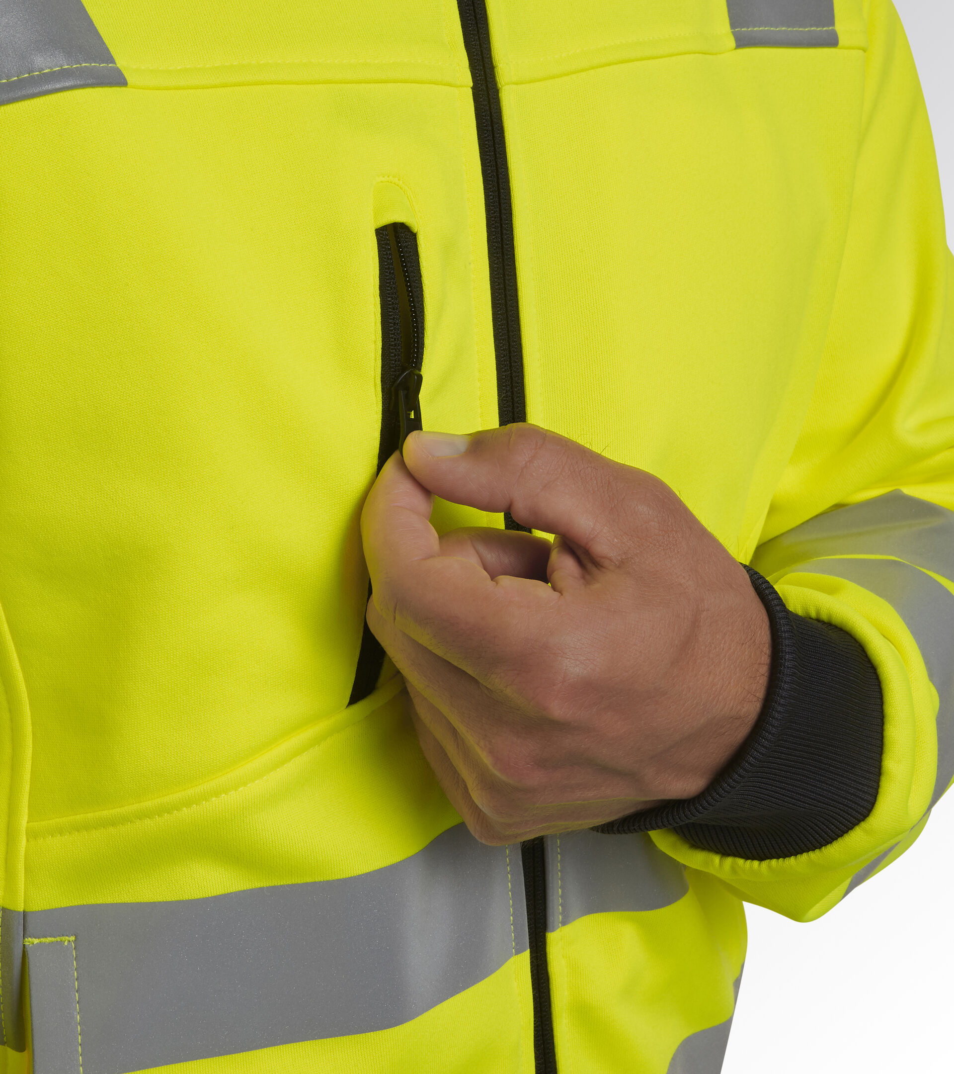 Błyszcząca bluza z przewiewnego, nieczesanego materiału o podwójnej konstrukcji: zewnętrzna strona z poliestru i wewnętrzna bawełniana dzianina. Regulowany kaptur ze sznurkiem, kieszeń na piersi na suwak i dwie otwarte kieszenie boczne. Taśmy odblaskowe na korpusie, rękawach i ramionach. EN 20471: klasa 2
