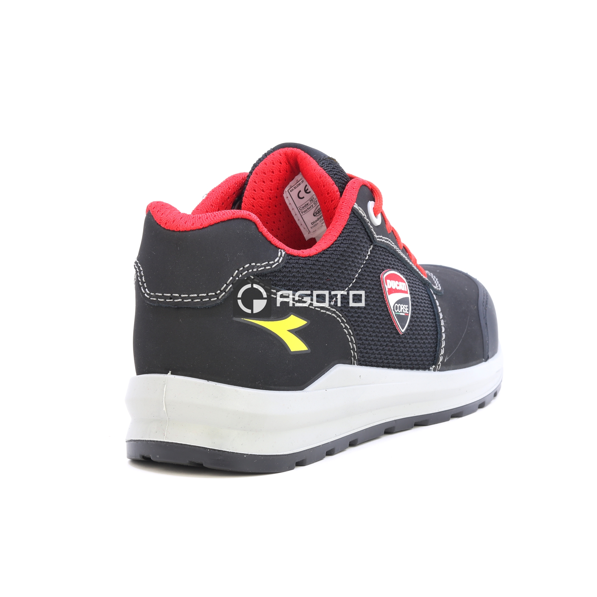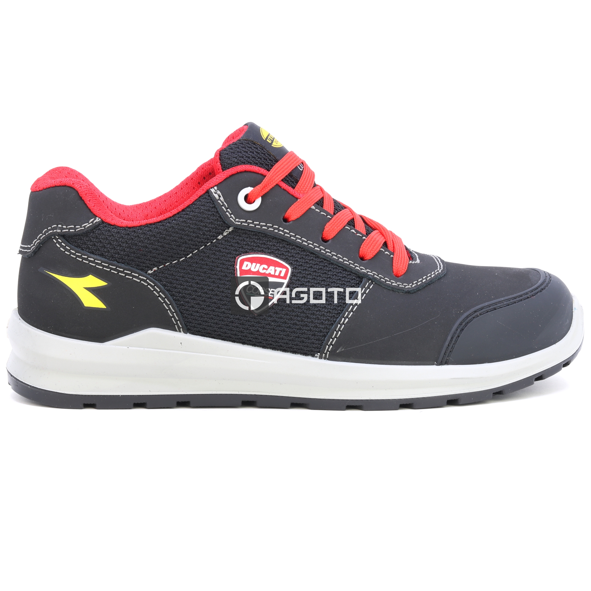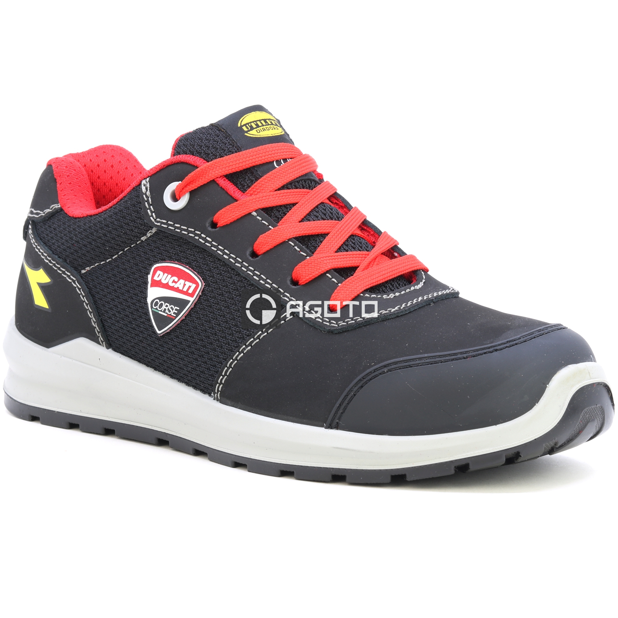 Półbuty ochronne Ducati Speedy Race S1PS z materiału Action Nubuck, zamszu ze skóry bydlęcej pokrytego ochronną folią poliuretanową z obróbką nubuku i tkaniny poliestrowej. Marka DUCATI CORSE. Wzmocniony palec z TPU. Ciasto wielowarstwowe 200J. Wkładka antyprzebiciowa K-SOLE. Szerokość 11. Podszewka Air Mesh. Wyjmowana wkładka z mikroperforowanej pianki PU o otwartych komórkach, która oddycha dzięki węglowi aktywnemu.