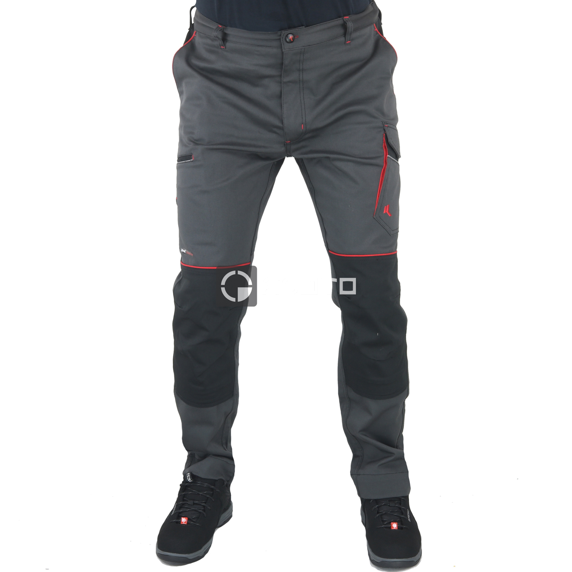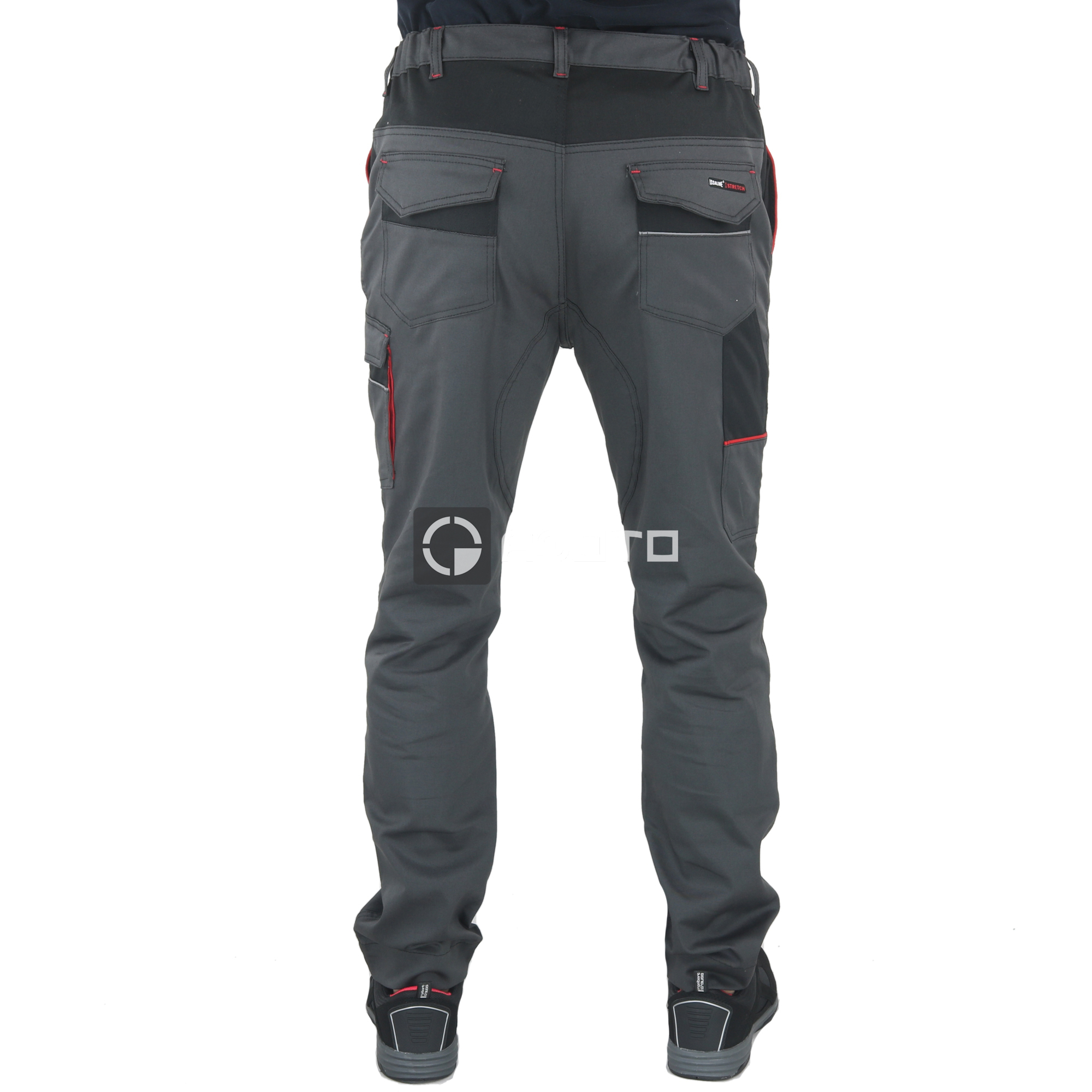 Elastyczne spodnie robocze z mieszanego materiału z dwiema przednimi kieszeniami, lewą kieszenią na nogawce, wysuwaną przednią kieszenią na telefon, dwiema tylnymi kieszeniami i jedną kieszenią na taśmę mierniczą.