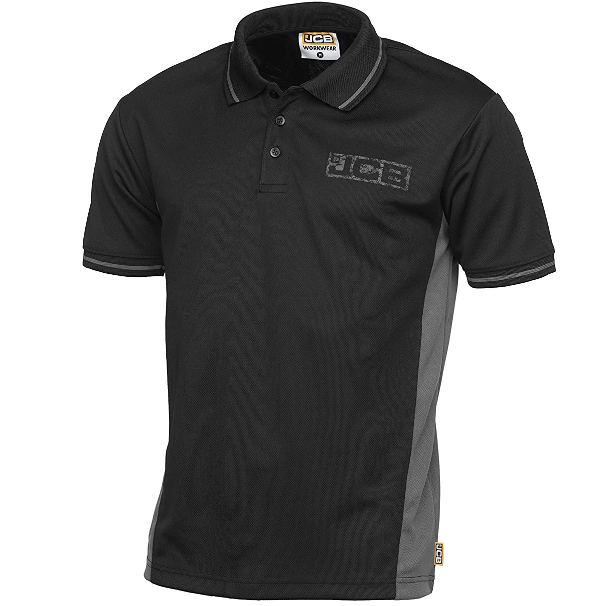 Rychleschnoucí polokošile 100% polyester, 175 g / m2. Tkanina odvádějící vlhkost s antibakteriální úpravou. Černé a šedé kontrastní styly. Tři knoflíky vpředu. Plochý pletený límec a manžety. Logo JCB na levé straně hrudi. Tkaná značka JCB na švu vlevo.