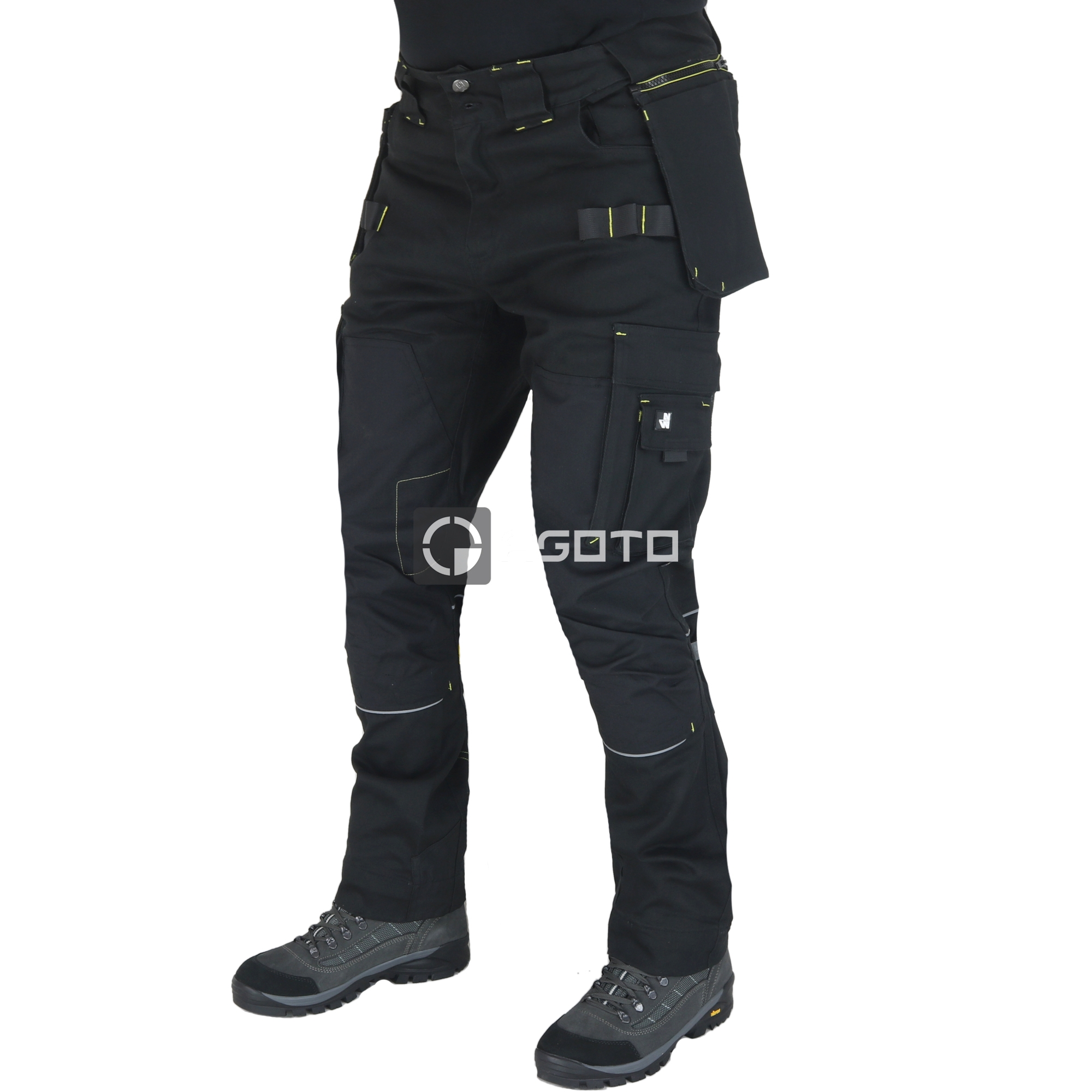 Męskie spodnie robocze NINE WORTHS Howard Stretch w kolorze czarnym zostały zaprojektowane z myślą o maksymalnym komforcie i trwałości podczas wymagającej pracy. Główny materiał składa się z 98% bawełny i 2% elastanu (300 g/m2) o diagonalnym kroju, który zapewnia elastyczność i wygodę podczas ruchu. Spodnie wzmocniono w miejscach narażonych na obciążenia poliestrem 600D Oxford z powłoką PU (250 g/m2), a nakolanniki wykonano z wytrzymałego materiału CORDURA® 500D (100% poliamid z powłoką PU, 245 g/m2). Spełniają wymagania normy EN 14404+A1 poziom 1, co potwierdza ich ochronę. Posiadają regulowany pasek MOOV oraz 12 kieszeni, w tym na narzędzia, smartfon i składaną miarkę. Spodnie mają również pętle na narzędzia, potrójne szwy zwiększające trwałość i regulowany dół.