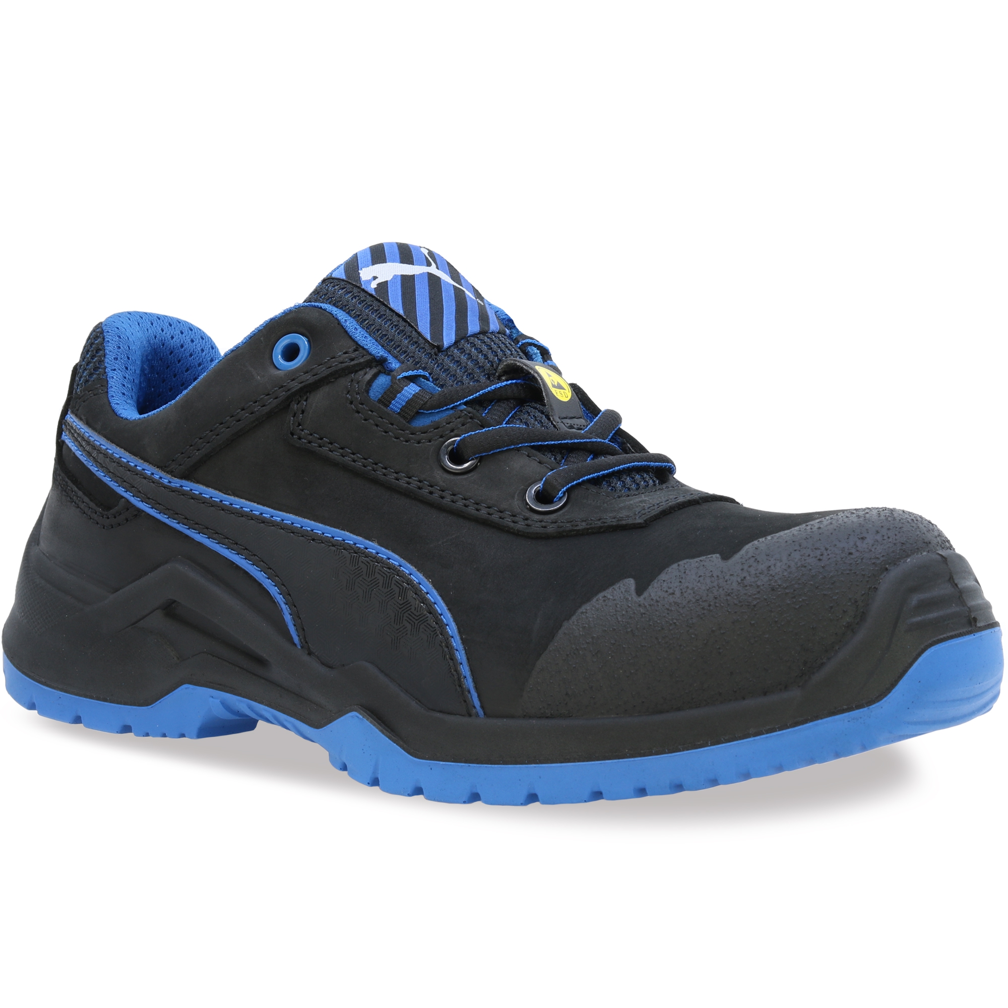 ARGON BLUE LOW z linii TECHNICS. Linia PUMA SAFETY charakteryzuje się dużą elastycznością i efektowną lekką konstrukcją. Osiągnięto to dzięki architekturze naturalnej podeszwy FLEXMOTION®. Łączy koncepcję „Natural Running” z najnowszą technologią obuwia ochronnego. But ochronny S3 o właściwościach ESD, wykonany z olejowanej skóry nubukowej, jest wyposażony w bardzo wytrzymały nosek z włókna szklanego i ochronę przed perforacją FAP®. Wkładka Evercushion® BA wykonana z pianki z otwartymi porami odprowadza wilgoć ze stopy, a wraz z oddychającą, funkcjonalną wyściółką BreathActive zapewnia stopie komfortowy klimat przez cały dzień. Specjalnie opracowany profil podeszwy gwarantuje najlepszą możliwą przyczepność, szczególnie na gładkich podłogach przemysłowych.