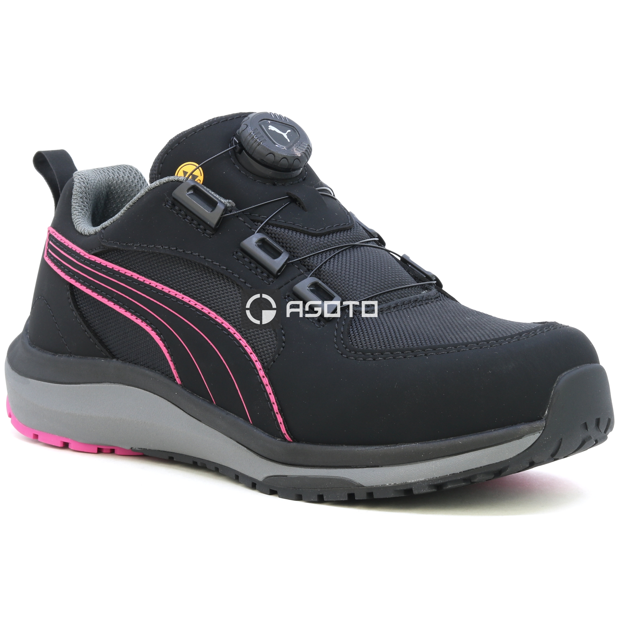 PUMA Aspire Pink Disc Low S3 ESD to damski półbut roboczy zaprojektowany z myślą o maksymalnym bezpieczeństwie, wygodzie i funkcjonalności przez cały dzień pracy. Stalowy podnosek oraz elastyczna ochrona antyprzebiciowa FAP® LITE gwarantują niezawodną klasę ochrony S3S, a odporna na ciepło do 300 °C gumowa podeszwa MOTION WNS zapewnia pewny krok nawet w wymagających warunkach. Amortyzująca śródpodeszwa w połączeniu z TRIPLE ARCH SUPPORT SYSTEM skutecznie redukuje zmęczenie stóp, co jest niezwykle ważne podczas długich zmian. System szybkiego zapięcia DISC umożliwia idealne dopasowanie buta jednym ruchem, dzięki czemu obuwie zawsze dobrze trzyma stopę. Wkładka evercushion® EASY oraz oddychająca wyściółka BreathActive dbają o suche i komfortowe środowisko wewnątrz buta. Model wykonany z trwałej mikrofibry i tekstylnego materiału jest wegański, wodoodporny, kompatybilny z ESD i doskonale sprawdzi się w budownictwie, przemyśle, logistyce oraz pracach rzemieślniczych. Aspire Pink Disc Low to wytrzymałe, funkcjonalne i wyjątkowo wygodne obuwie, które zna potrzeby użytkownika.