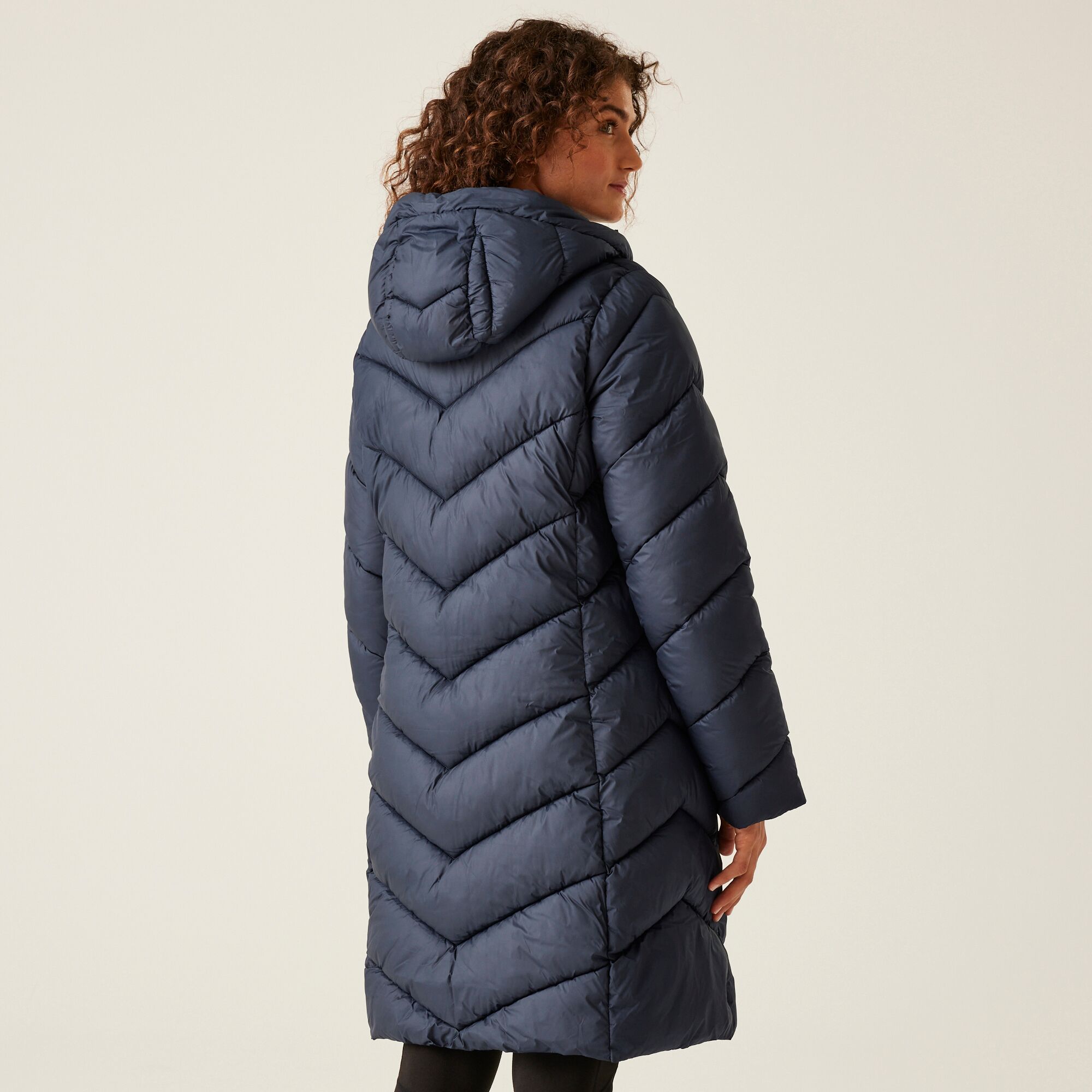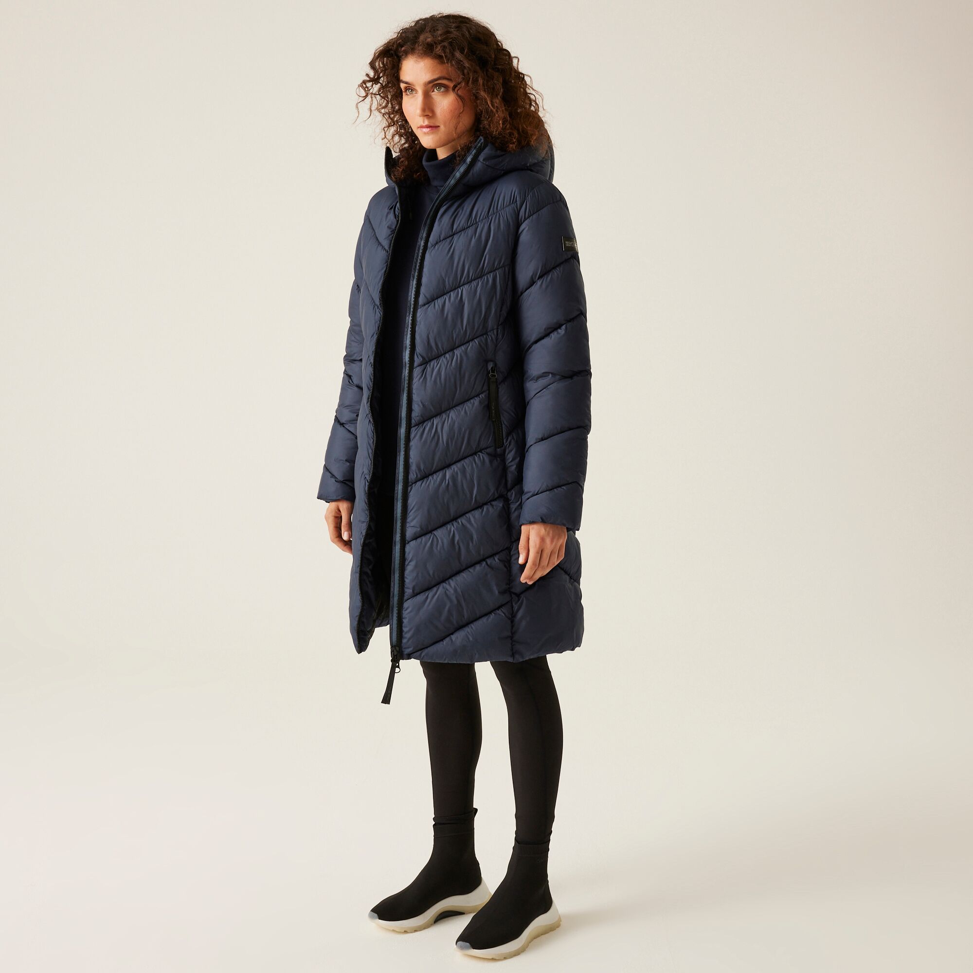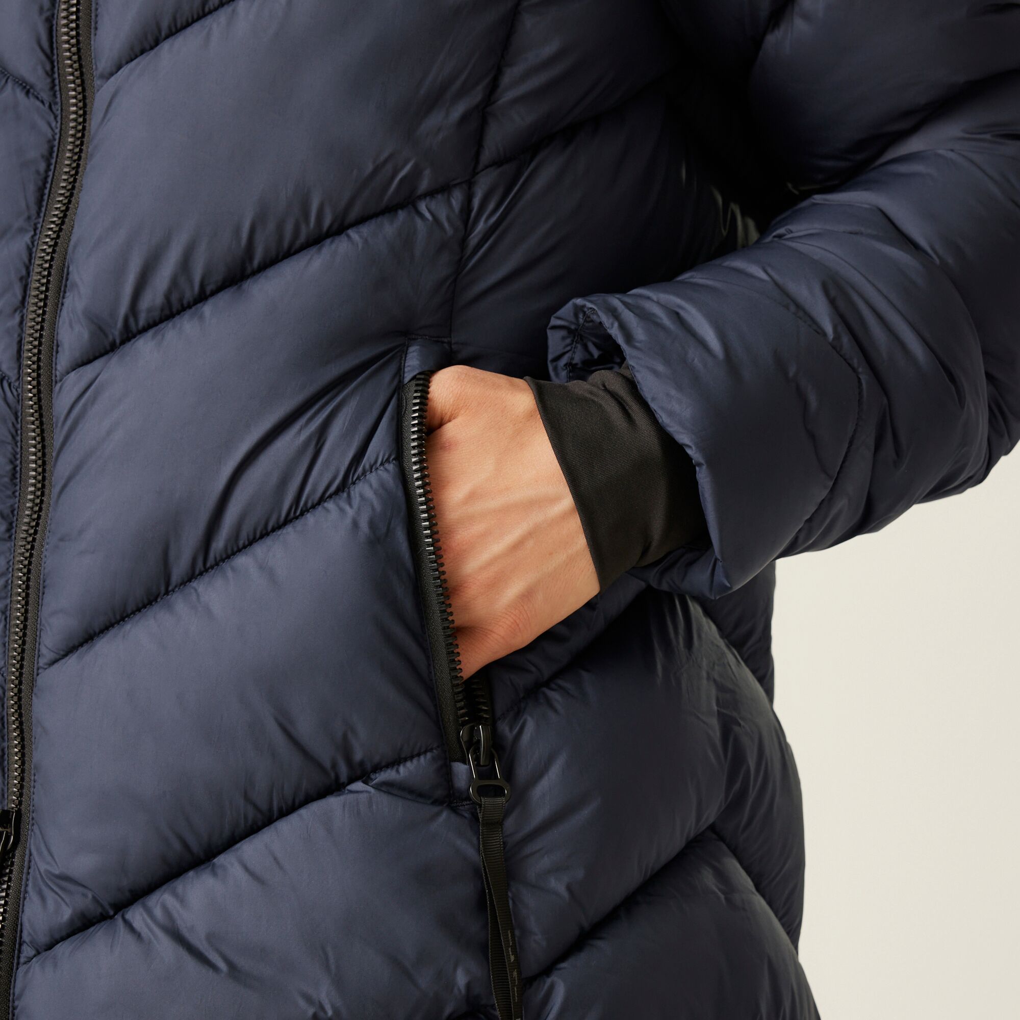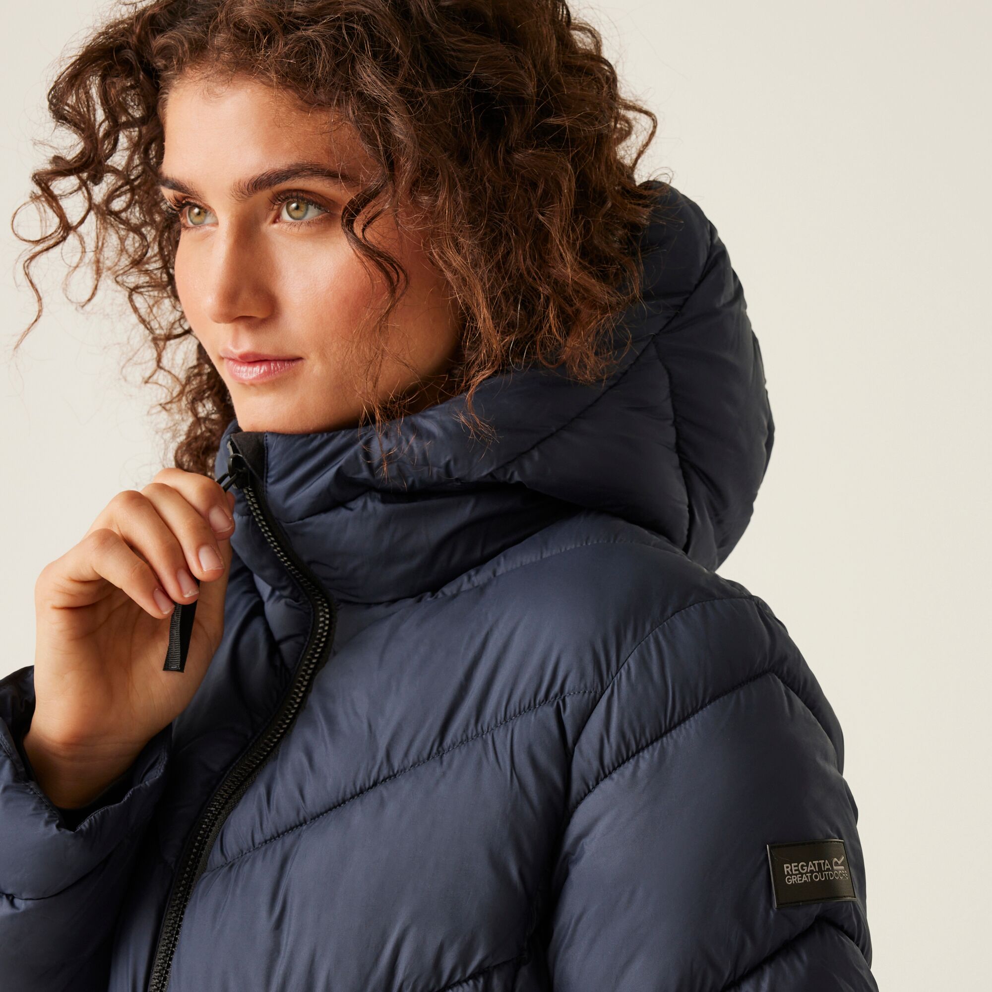 Damski płaszcz zimowy Andia II marki Regatta łączy w sobie styl, funkcjonalność i dbałość o środowisko. Wykonany z recyklingowanej tkaniny z 100% poliestru z hydrofobowym wykończeniem, skutecznie chroni przed zimnem, deszczem i śniegiem, jednocześnie wspierając zrównoważoną produkcję odzieży. Płaszcz został ocieplony wysokiej jakości recyklingowaną syntetyczną izolacją bez puchu, która zapewnia doskonałą ochronę termiczną nawet w niskich temperaturach. Wewnętrzna podszewka z poliamidu zwiększa komfort noszenia i trwałość. Dla większej wygody i ochrony płaszcz wyposażono w regulowany kaptur i wewnętrzne mankiety, które skutecznie zatrzymują ciepło. Dwukierunkowy zamek błyskawiczny z przodu umożliwia łatwe dopasowanie, a dwie dolne kieszenie na zamek zapewniają praktyczne miejsce na drobiazgi. To idealny wybór dla kobiet, które szukają ciepłego, stylowego i odpornego płaszcza zimowego, wykonanego z materiałów przyjaznych dla środowiska.