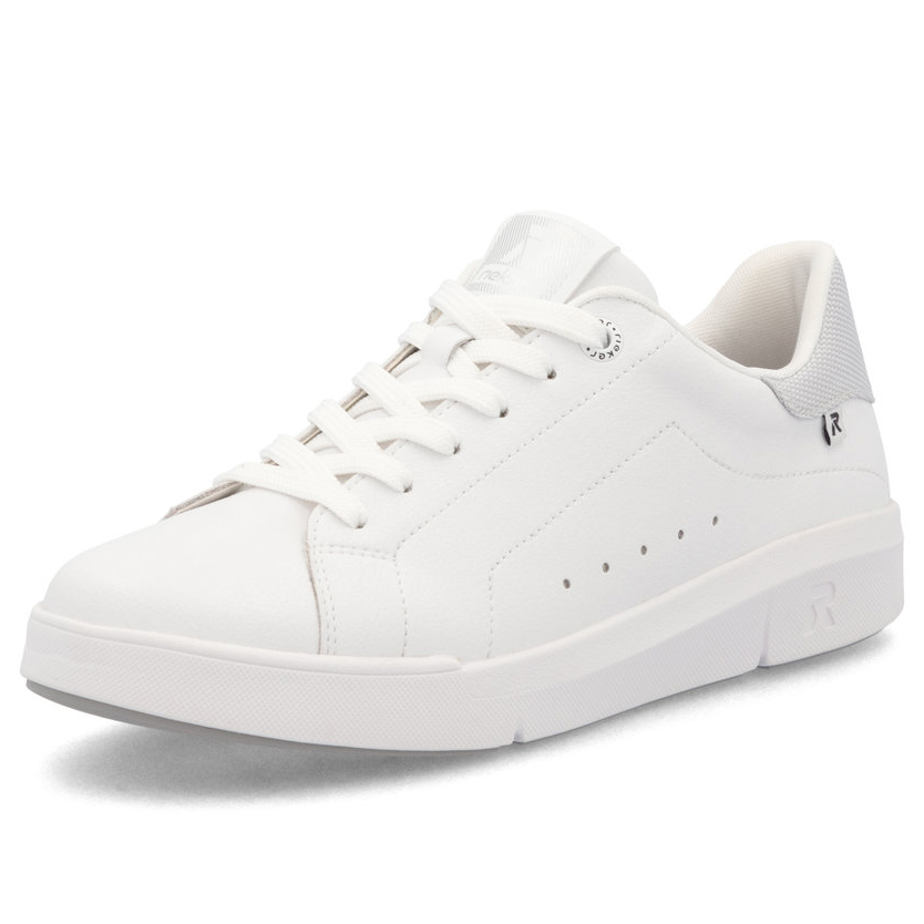 Ciesz się sportowym stylem z damskimi sneakersami marki RIEKER, które zapewnią Ci doskonały komfort i ponadczasowy wygląd na co dzień. Skórzana cholewka w białym kolorze ozdobiona szarymi aplikacjami i logo marki nadaje butom nowoczesny i elegancki wygląd. Sznurowanie pozwala idealnie dopasować buty do stopy, a miękka wkładka zapewnia wygodę przy każdym kroku. Wkładka jest również wyjmowana, co ułatwia jej wietrzenie lub wymianę. Te sneakersy będą doskonałym wyborem na aktywności rekreacyjne, spacery po mieście lub do codziennych, swobodnych stylizacji do pracy. Połączenie nowoczesnego wyglądu i funkcjonalnych technologii gwarantuje komfort chodzenia i styl, który pokochasz.