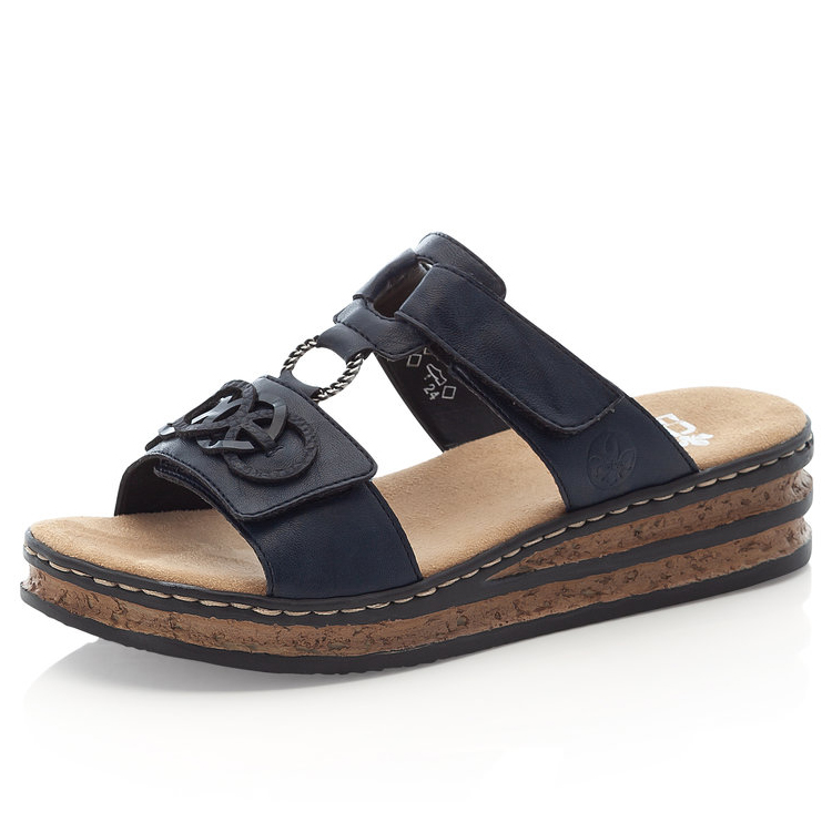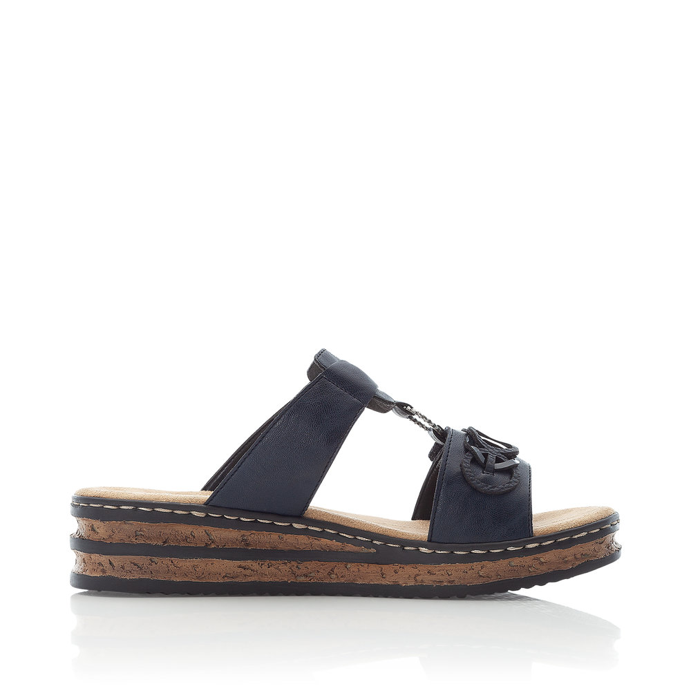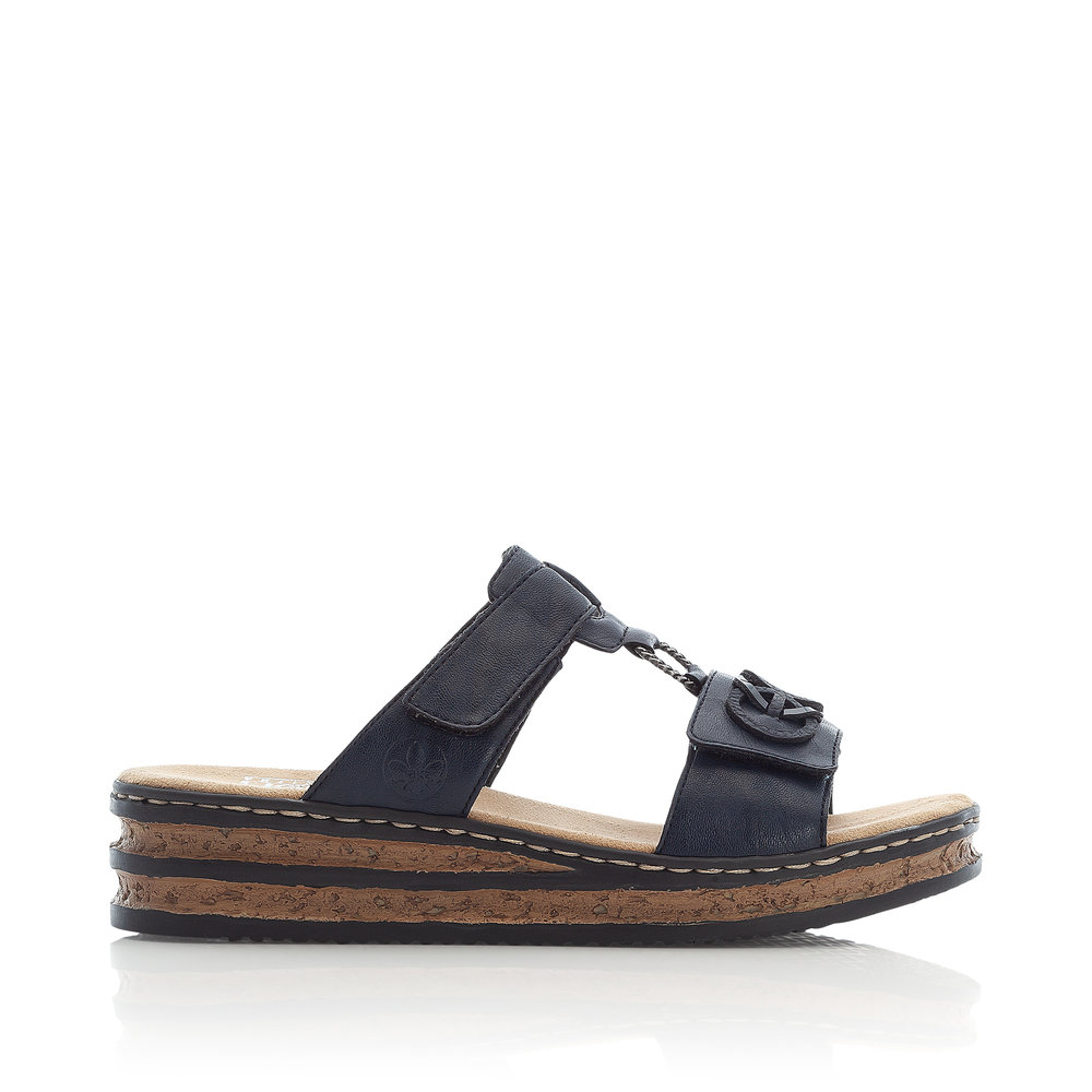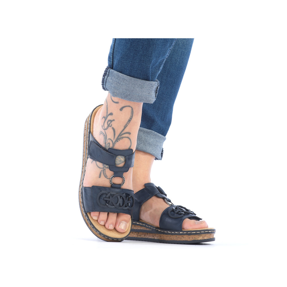Te damskie klapki marki RIEKER to doskonały wybór dla kobiet ceniących sobie prostą elegancję. Cholewka w kolorze ciemnoniebieskim ozdobiona jest na przednim pasku dekoracyjnym splotem pierścieni, a metalowy element łączy przednią część z paskiem na podbiciu, nadając butom wyjątkowy charakter. Oba paski posiadają rzepy, dzięki czemu można idealnie dopasować obuwie do stopy. Miękka wkładka wykonana z przyjemnego materiału gwarantuje komfort przez cały dzień. Stylowa podeszwa z korkowym detalem i czarnymi paskami dopełnia efektownego wyglądu sandałów. Te klapki świetnie komponują się z długimi spódnicami i sukienkami, nadając się zarówno na co dzień, jak i na specjalne okazje.