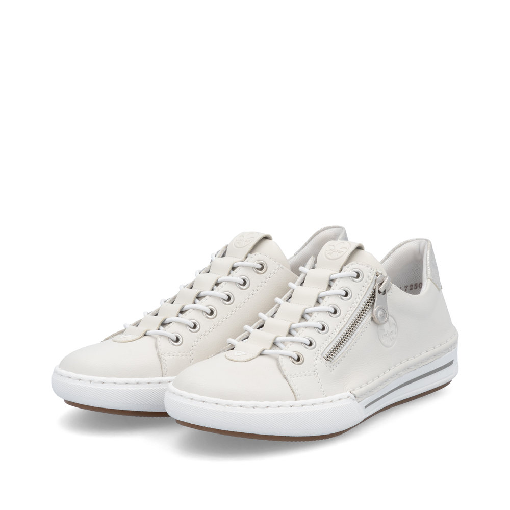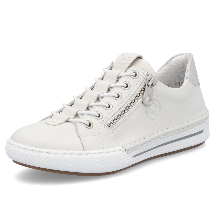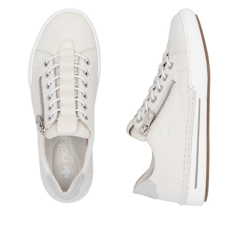 Te jasne trampki marki RIEKER oferują świeży wygląd i stylowe akcenty, które przyciągają uwagę od pierwszego spojrzenia. Dekoracyjne logo marki podkreśla autentyczność, a subtelny metaliczny detal na pięcie nadaje wyjątkowego charakteru. Dzięki praktycznemu zamkowi błyskawicznemu i elastycznemu sznurowaniu na gumkę, buty zakłada się szybko i wygodnie. Lekka i elastyczna podeszwa z technologią Antistress skutecznie amortyzuje wstrząsy, zapewniając komfortowy krok. Wyjmowana wkładka Rieker Soft z oddychającego materiału oferuje maksymalną wygodę przez cały dzień. To idealny wybór dla tych, którzy szukają połączenia oryginalnego wyglądu i wygody na każdy dzień.
