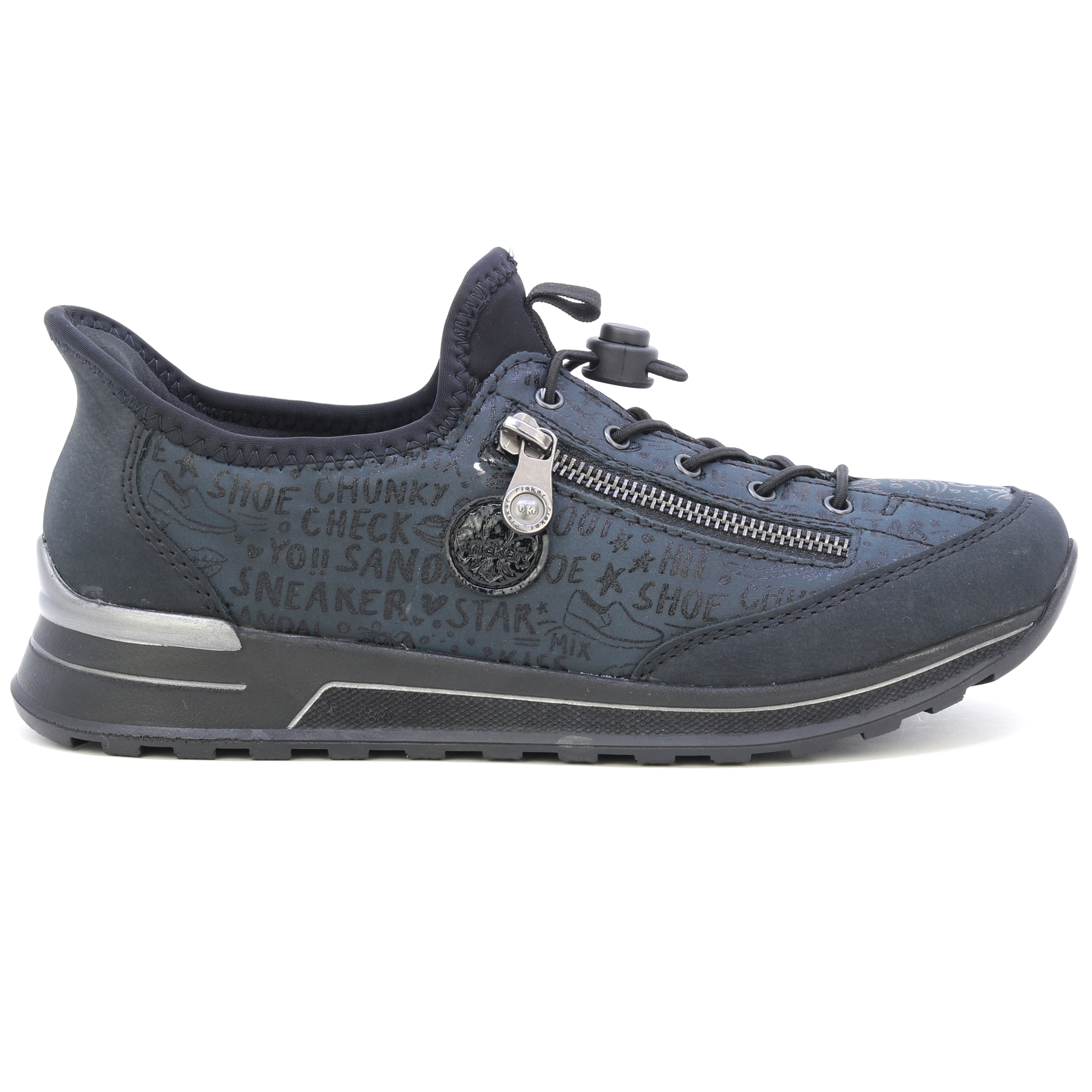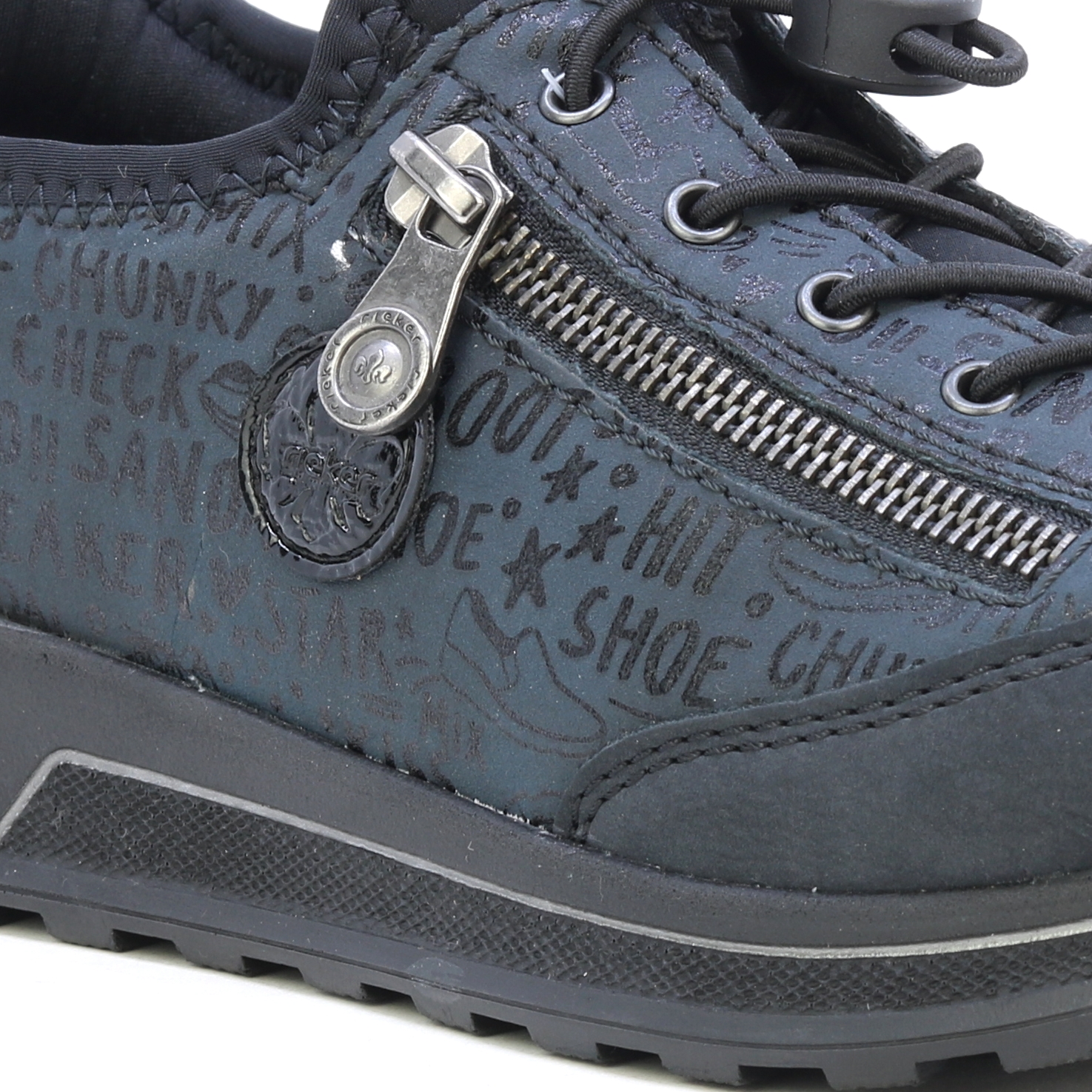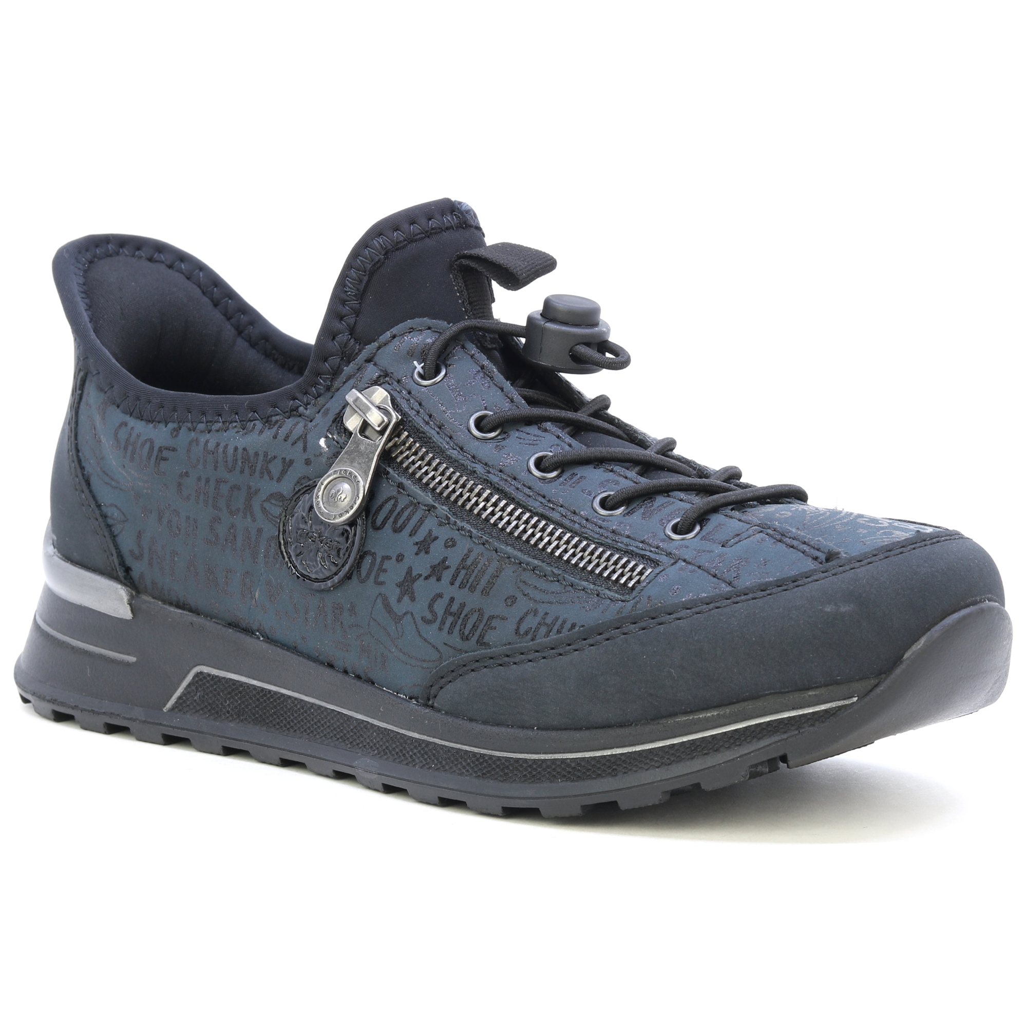 Te wyjątkowe sneakersy RIEKER oferują połączenie ciemnoniebieskiego koloru z unikalnym nadrukiem, ozdobnym zamkiem i logo marki, to połączenie dodaje butom nuty oryginalności. Elastyczne sznurowanie i elastyczna górna krawędź umożliwiają łatwe zakładanie i zdejmowanie. Miękka wyjmowana wkładka i elastyczna podeszwa zapewniają maksymalny komfort i wsparcie przez cały dzień. Te sneakersy są nie tylko stylowe, ale także praktyczne w codziennym noszeniu. Technologia: Antystresowa – dzięki czterem właściwościom antystresowym – lekkości, elastyczności, przestronności i doskonałej amortyzacji – buty RIEKER zapewnią Ci bardziej komfortowy spacer.
