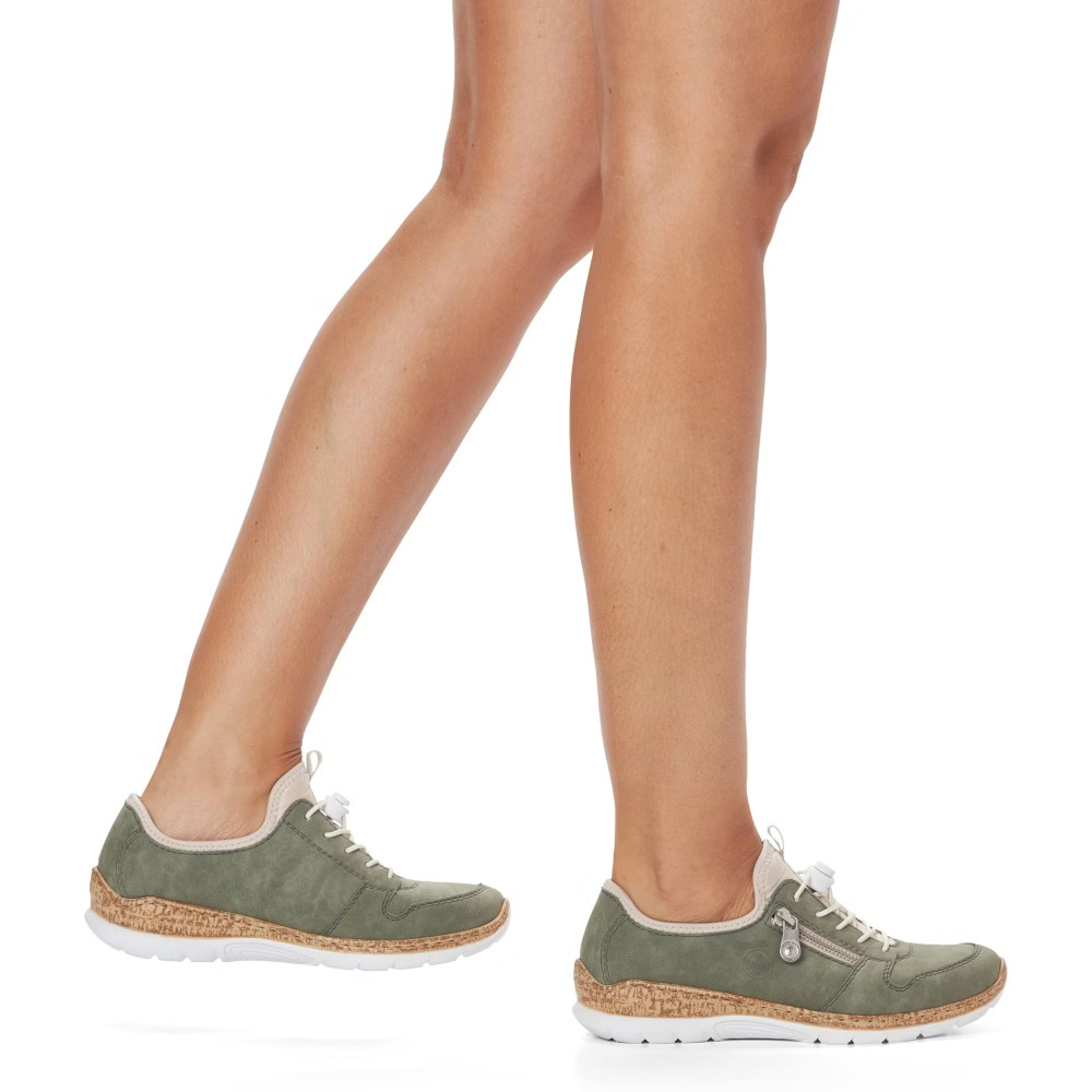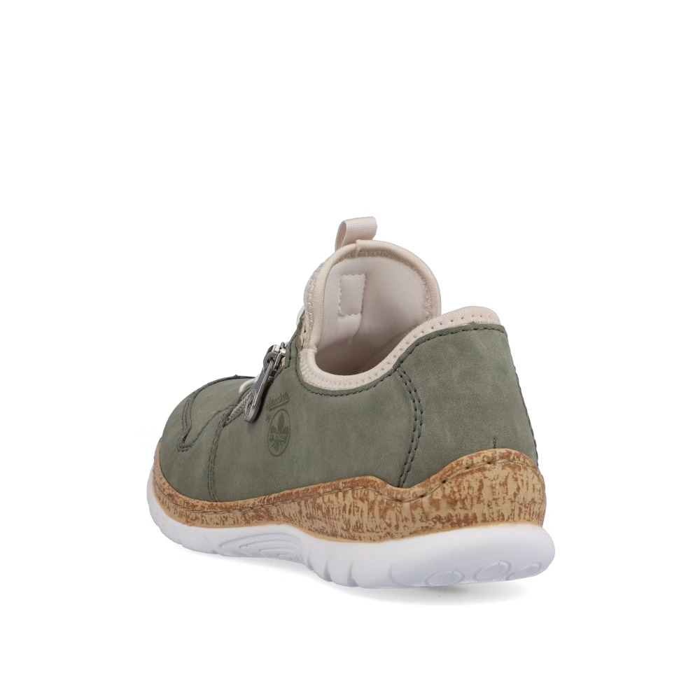 Te botki firmy RIEKER stanowią idealne połączenie elegancji i sportowego stylu. Zielona gładka cholewka jest akcentowana drobnymi przeszyciami, wytłoczonym logo i srebrnym zamkiem błyskawicznym. Górna część wykończona lekkim elastycznym materiałem ułatwiającym zakładanie butów. Sznurowanie na gumki pozwala na łatwe dopasowanie butów dokładnie do Twoich potrzeb. Tekstylna wkładka wykonana z pianki memory zapewnia miękkość przy każdym kroku i idealnie dopasowuje się do kształtu stopy. Dzięki technologii Antistress podeszwa jest lekka, elastyczna i amortyzująca, zapewniając wygodne dopasowanie. Model ten idealnie nadaje się do noszenia na co dzień, zarówno do pracy, jak i na zakupy po mieście. Technologia: Antistress: Lekka i elastyczna podeszwa, która amortyzuje wstrząsy i dopasowuje się do kształtu stopy, zapewniając maksymalny komfort. MemoSoft: Unikalna wkładka z pianki memory, która zapewnia miękkość i maksymalne dopasowanie do kształtu stopy.