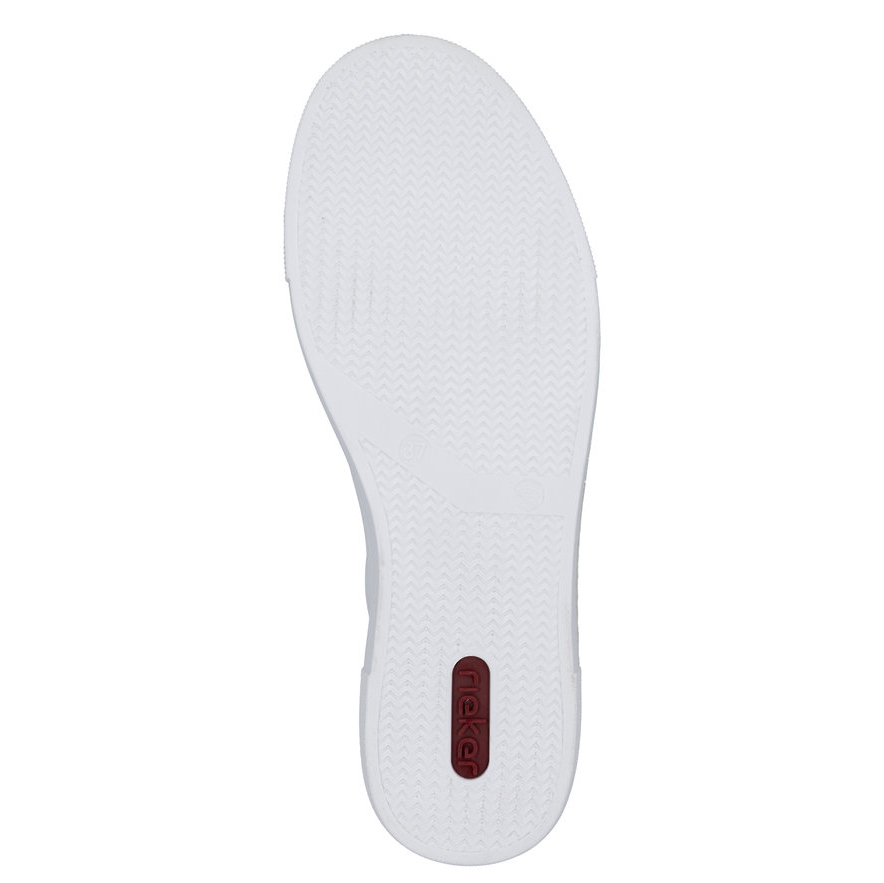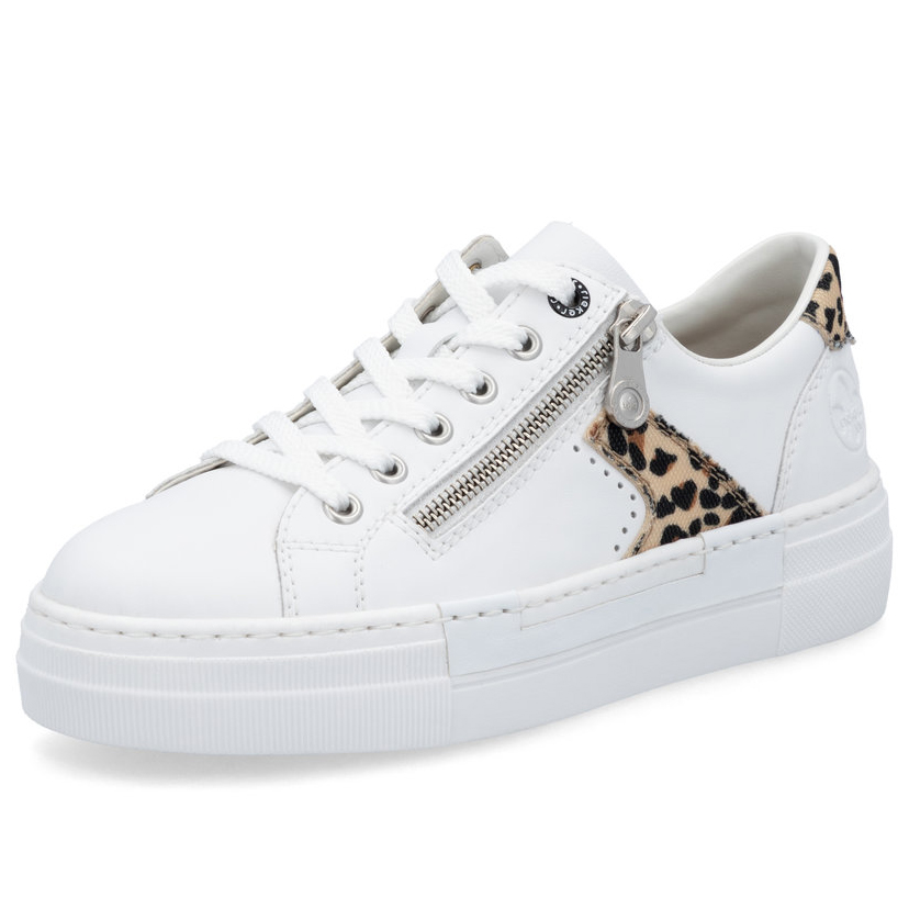 Nowoczesne tenisówki RIEKER zachwycą Cię już na pierwszy rzut oka dzięki oryginalnemu designowi, który łączy białą cholewkę z atrakcyjnymi aplikacjami w zwierzęcy wzór. Praktyczny boczny zamek błyskawiczny ułatwia szybkie zakładanie i zdejmowanie butów, a sznurowanie pozwala idealnie dopasować je do kształtu Twojej stopy. Miękka wkładka z pianki Memory MemoSoft gwarantuje wyjątkowy komfort, amortyzując wstrząsy i doskonale dopasowując się do stopy, co zapewnia wygodę nawet podczas długiego noszenia. Lekka i elastyczna konstrukcja buta w połączeniu z technologią Rieker Antistress sprawia, że chodzenie w nich jest niezwykle przyjemne i komfortowe. Wybierz te unikalne tenisówki RIEKER i ciesz się wysokiej jakości, stylowym i wygodnym obuwiem, które stanie się nieodzownym elementem Twojej garderoby.