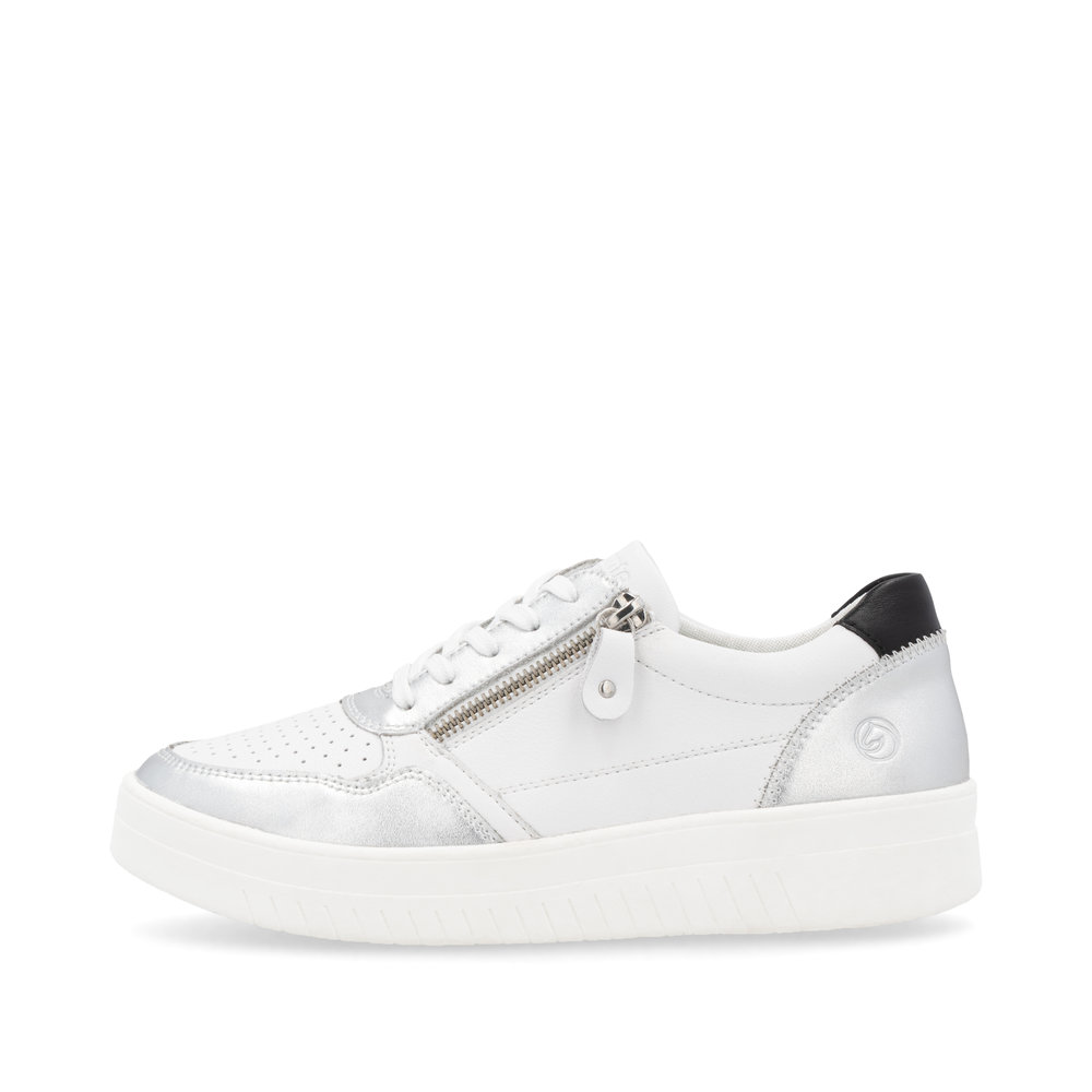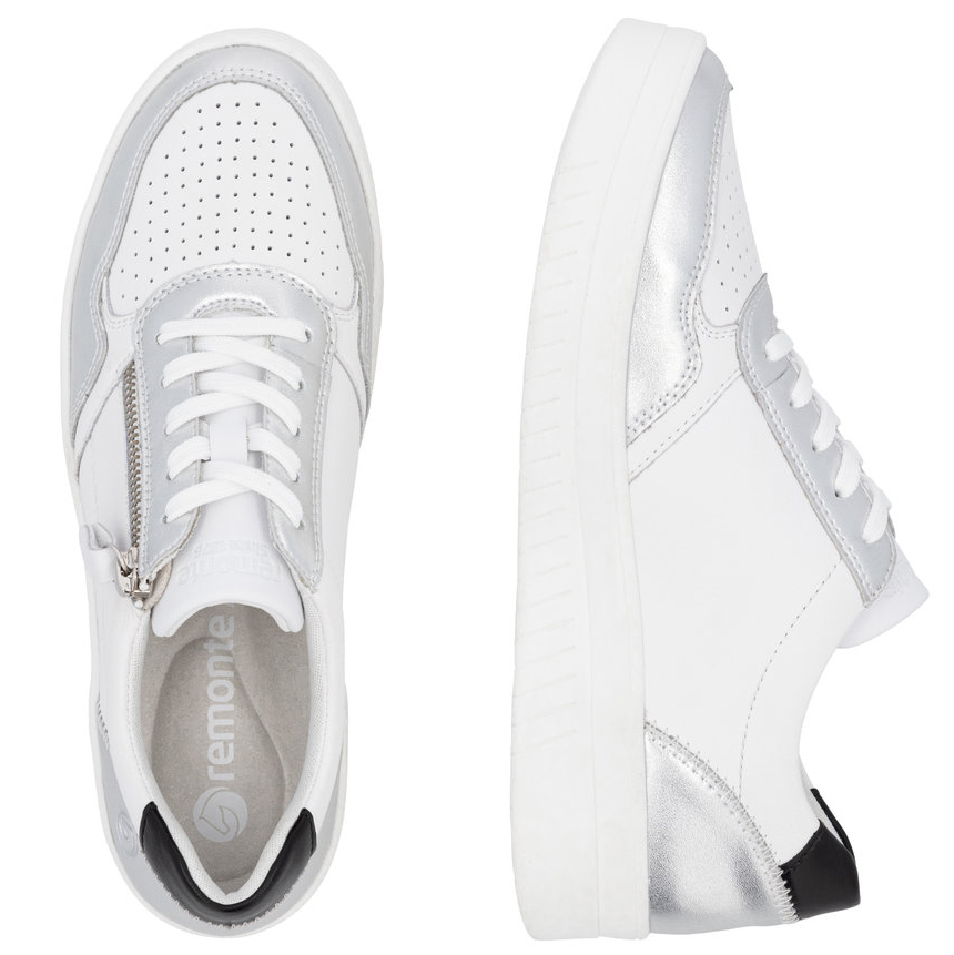 Obuwie REMONTE to wyższa linia marki RIEKER, która charakteryzuje się wysoką jakością użytych materiałów. Damskie tenisówki od razu przyciągają uwagę dzięki białemu wierzchowi, który jest doskonale uzupełniony wyrazistymi metalicznymi akcentami. Zamek błyskawiczny na zewnętrznej stronie buta ułatwia zakładanie, a sznurowadła pozwalają na precyzyjne dopasowanie obuwia do Twoich potrzeb. Komfort noszenia zapewnia miękka, wyjmowana wkładka, która zapewnia wygodę przez cały dzień. Model ten świetnie komponuje się z innymi akcesoriami, takimi jak plecak z naszej szerokiej oferty. Dzięki zastosowanej technologii Remonte Soft, unikalnej wkładce wykonanej z oddychającego materiału, buty zapewniają poczucie komfortu przez cały dzień. Technologia Lite’n Soft gwarantuje maksymalny komfort dzięki lekkiej podeszwie, bardzo przyjemnym materiałom i komfortowej wkładce.