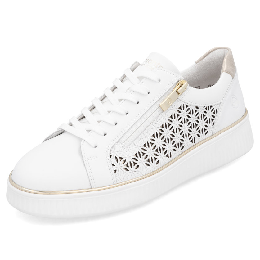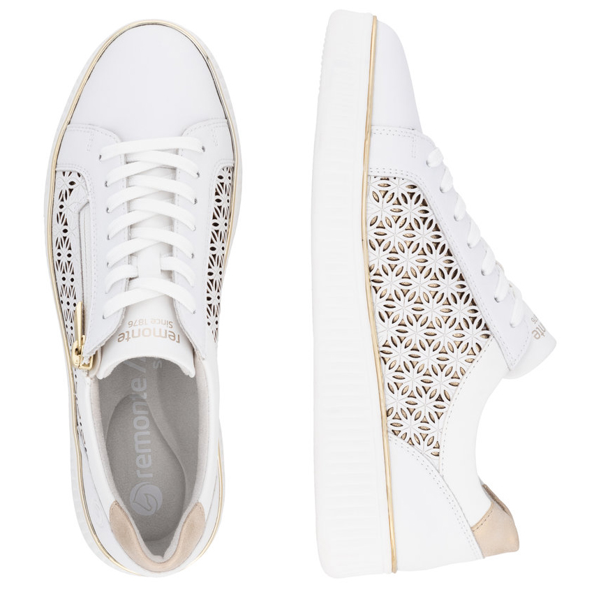 Obuwie REMONTE to ekskluzywna linia marki RIEKER, wyróżniająca się doskonałym wykonaniem i starannie dobranymi materiałami. Te białe sneakersy zachwycają subtelną perforacją oraz stylowymi złotymi akcentami, które nadają im wyjątkowej elegancji, a metaliczny detal na pięcie podkreśla ich nowoczesny charakter. Praktyczny zamek błyskawiczny na podbiciu umożliwia szybkie zakładanie butów, a sznurowanie pozwala idealnie dopasować je do stopy. Wyjmowana miękka wkładka zapewnia wygodę przez cały dzień, a lekka, kontrastowa podeszwa nie tylko podkreśla modny design, ale także gwarantuje stabilność. Dzięki zastosowanym technologiom Remonte Soft i Lite'n Soft komfort noszenia jest na najwyższym poziomie. To doskonały wybór dla kobiet, które poszukują stylowych i wygodnych sneakersów z wyjątkowymi detalam