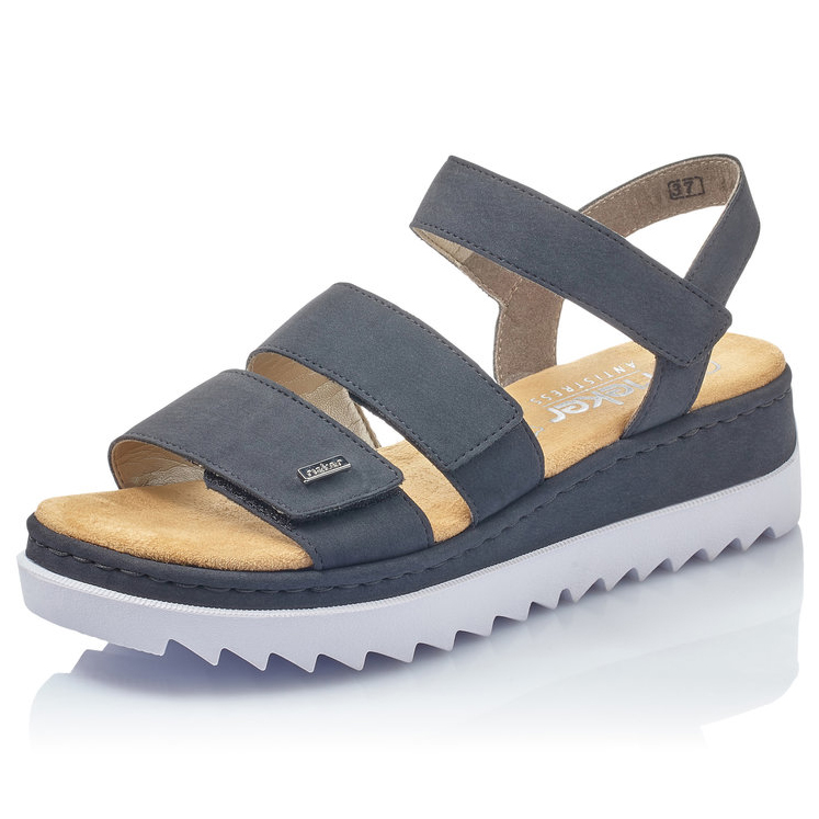Damskie sandały RIEKER to doskonałe połączenie stylowego wyglądu i wygody, idealne na co dzień. Granatowa cholewka zamszowa dodaje elegancji, a metalowe logo Rieker w przedniej części podkreśla wyjątkowy design buta. Trzy przednie paski na rzep umożliwiają idealne dopasowanie do stopy, zapewniając pełen komfort podczas chodzenia. Biała kontrastowa podeszwa z wyrazistym bieżnikiem nie tylko dodaje sandałom charakteru, ale również skutecznie amortyzuje wstrząsy i zapewnia stabilność na różnych nawierzchniach. To świetny wybór zarówno do pracy, jak i na spacer z dziećmi, gdzie docenisz ich lekkość, elastyczność i wygodę.