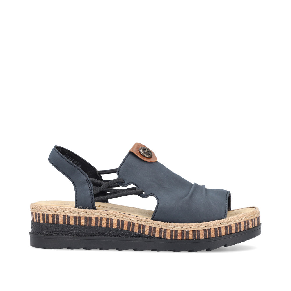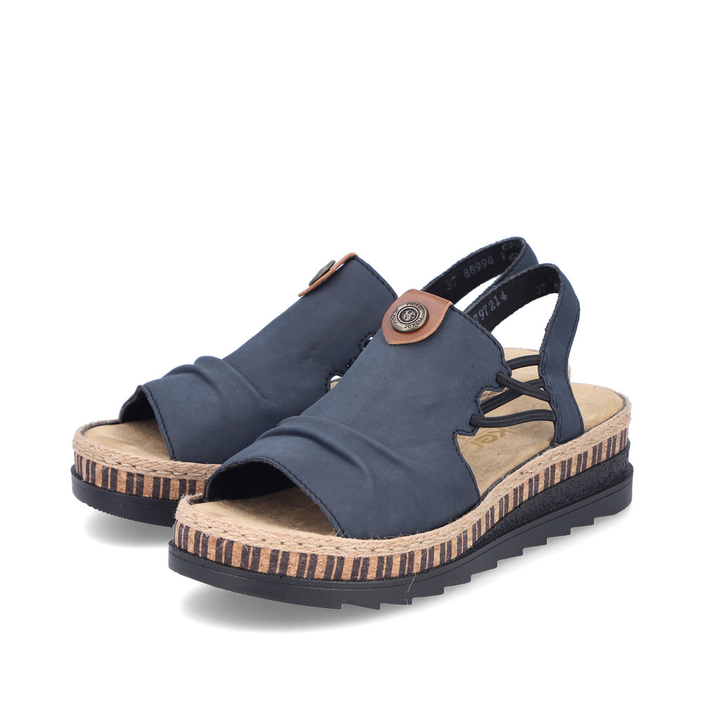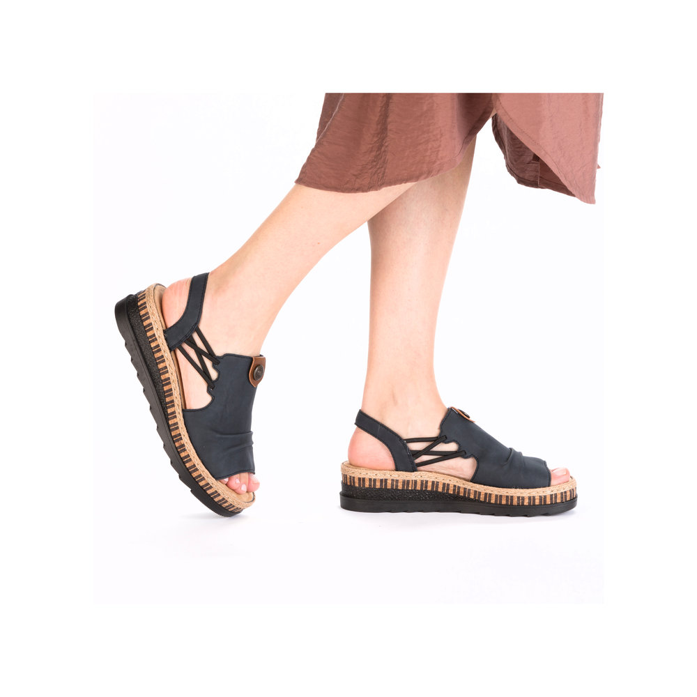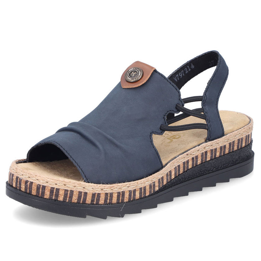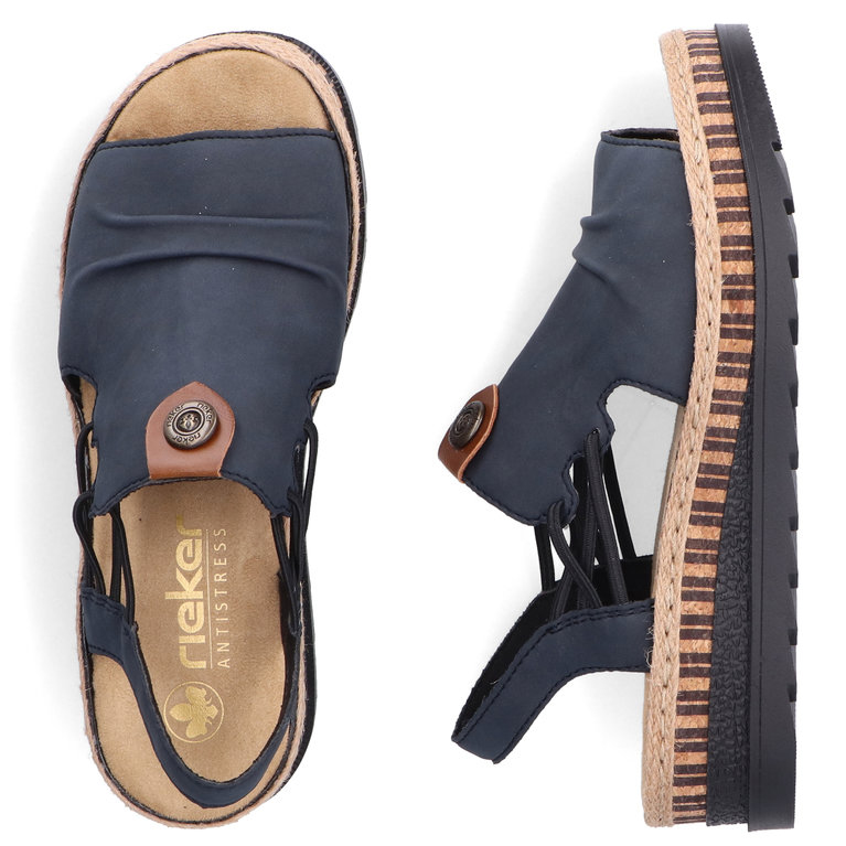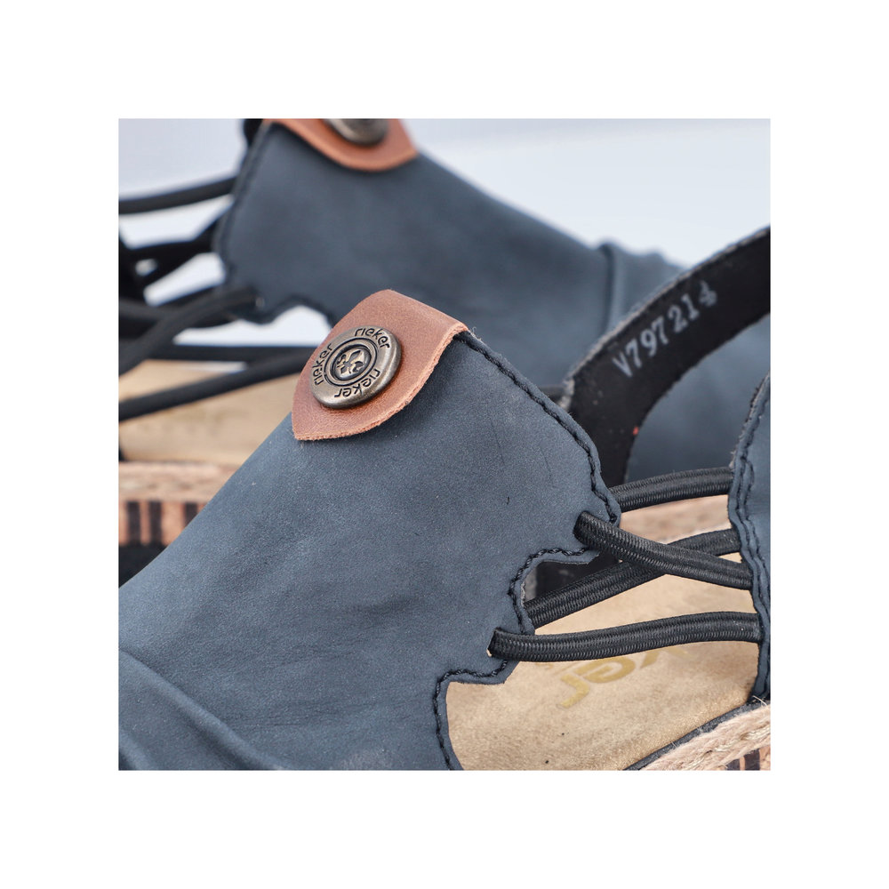 Damskie sandały RIEKER V7972-14 w eleganckim odcieniu niebieskiego to doskonały wybór dla kobiet ceniących wygodę i styl. Ich wysokiej jakości cholewka ozdobiona subtelnymi detalami nadaje im nowoczesnego wyglądu, a elastyczne paski na podbiciu ułatwiają zakładanie i idealnie dopasowują się do stopy. Miękka wkładka oraz lekka, elastyczna podeszwa zapewniają komfort przez cały dzień. Te sandały świetnie komponują się zarówno z letnimi sukienkami, jak i casualowymi spodniami, sprawdzając się zarówno na spacery po mieście, jak i podczas wakacyjnych wyjazdów. Technologia Antistress gwarantuje lekkość, elastyczność i skuteczną amortyzację wstrząsów przy chodzeniu.