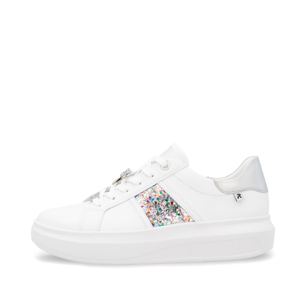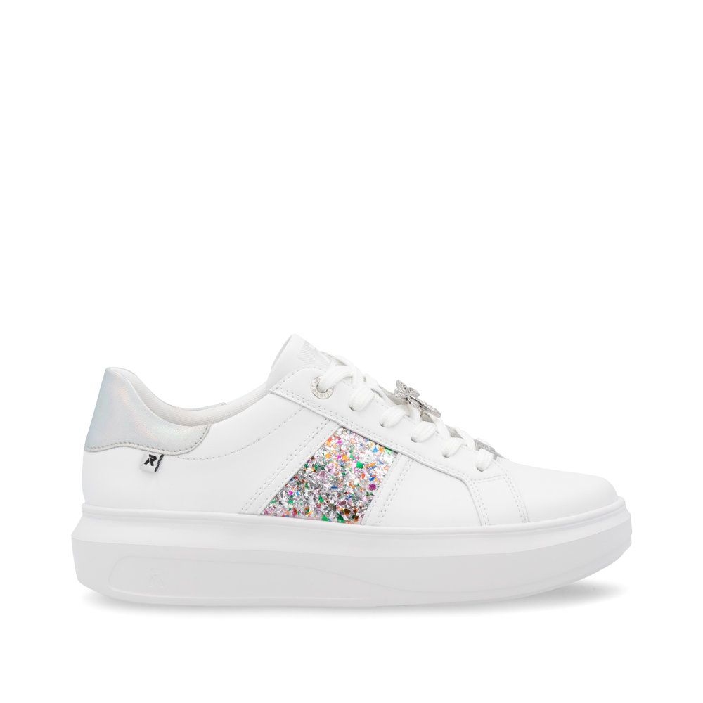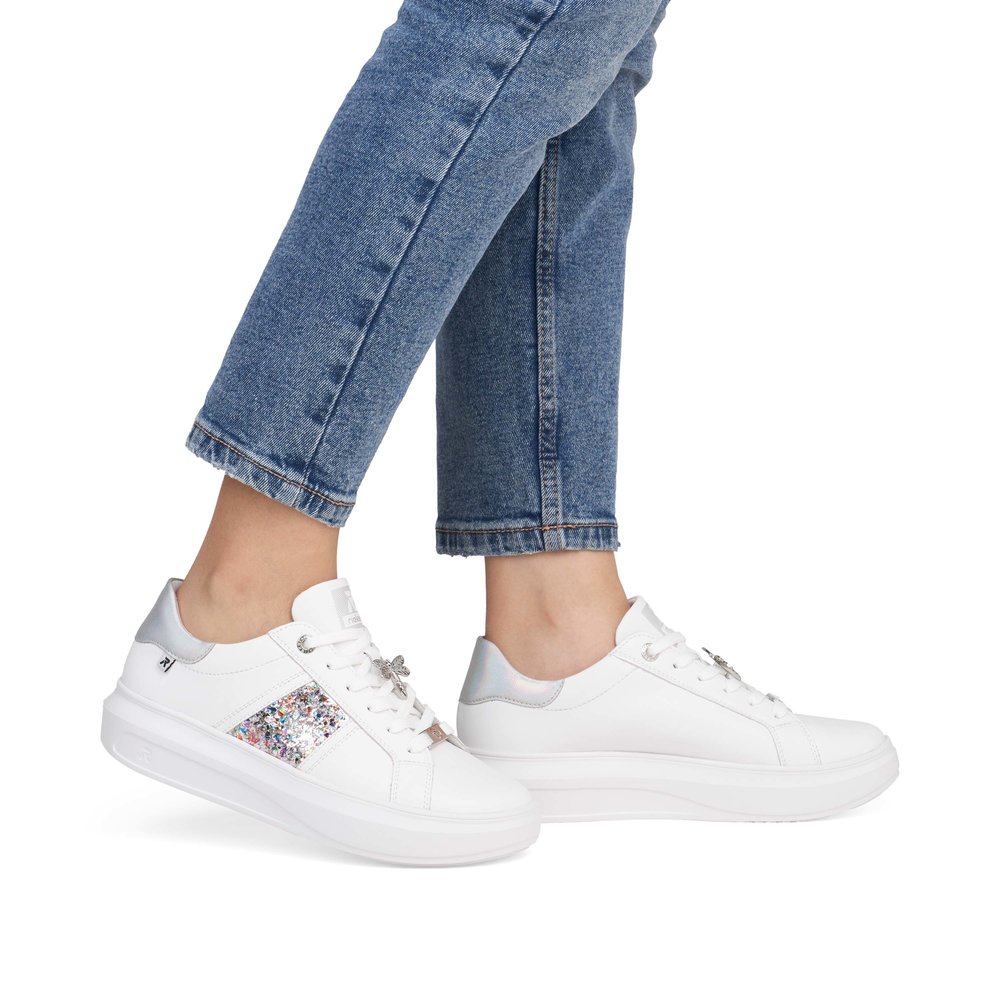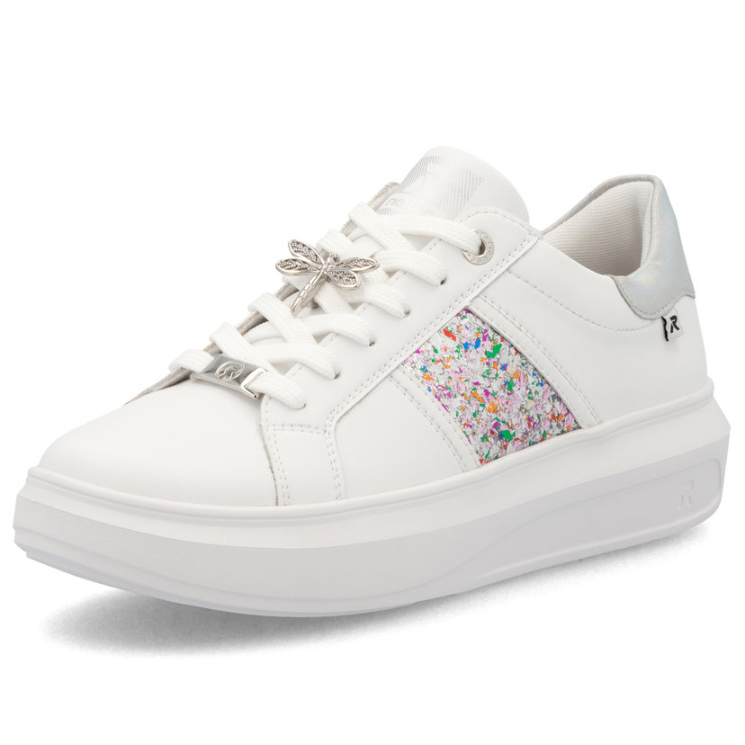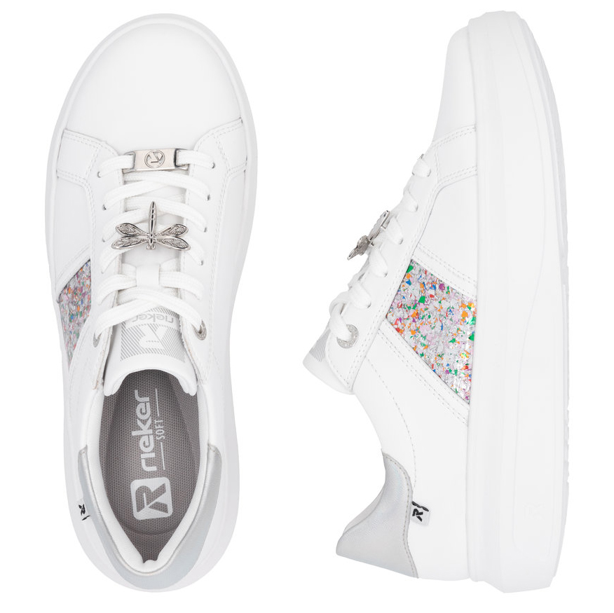 Dodaj swojemu stylowi sportowej elegancji dzięki tenisówkom RIEKER, które łączą nowoczesny design z maksymalnym komfortem. Biała skórzana cholewka została ozdobiona stylową aplikacją po bokach oraz subtelnymi, opalizującymi detalami na pięcie, które nadają butom wyjątkowego charakteru. Na sznurowadłach znajdziesz elegancką ważkę i logo marki, które podkreślają staranne wykonanie. Wyjmowana wkładka zapewnia optymalny komfort i wsparcie, a stabilna, wyższa podeszwa gwarantuje wygodę podczas chodzenia przez cały dzień. Jeśli szukasz połączenia stylu i funkcjonalności, tenisówki RIEKER Sport są idealnym wyborem.