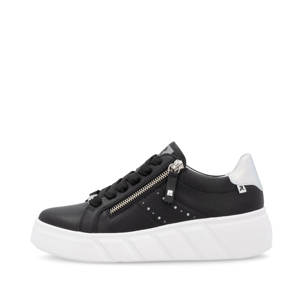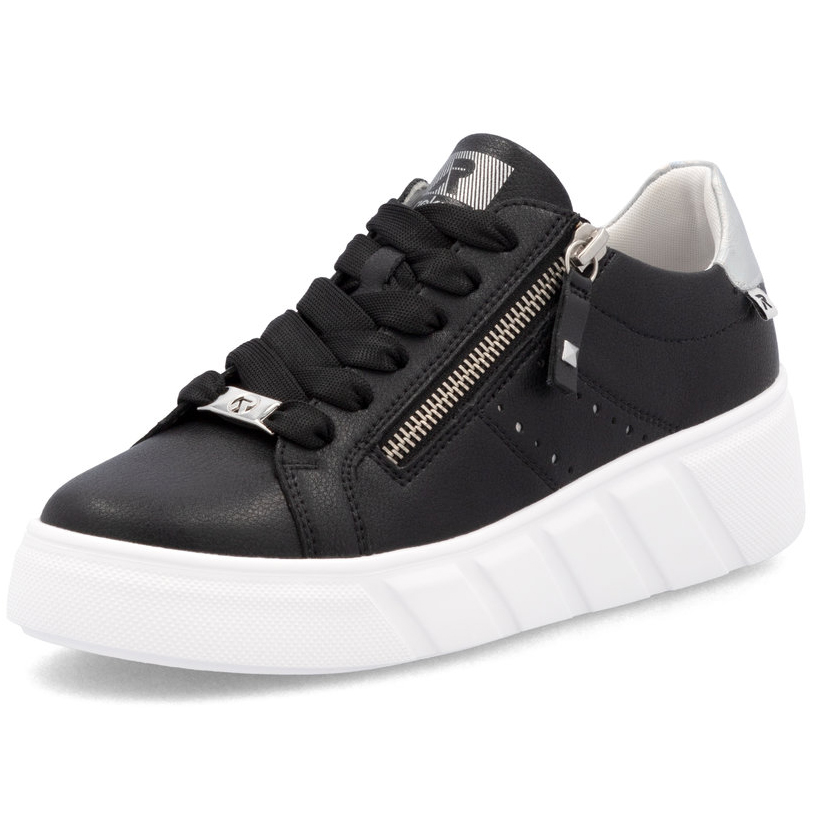 Ciesz się sportową elegancją z czarnymi skórzanymi tenisówkami RIEKER, które łączą prostotę, styl i funkcjonalność. Dekoracyjny element po bokach oraz subtelne logo marki nadają modelowi unikalnego charakteru, a solidna biała podeszwa nie tylko kontrastuje wizualnie, ale także skutecznie amortyzuje wstrząsy podczas chodzenia. Sznurowanie zapewnia stabilne dopasowanie, a praktyczny zamek błyskawiczny ułatwia zakładanie butów. Wyjmowana miękka wkładka gwarantuje maksymalny komfort nawet podczas długiego noszenia. Dzięki innowacyjnym technologiom Antistress i Rieker Soft buty te są lekkie, elastyczne i niezwykle wygodne – idealne na co dzień.