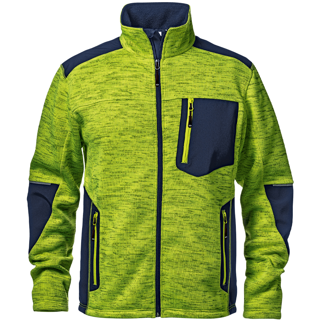 Ta techniczna bluza w formie kurtki została wykonana z wytrzymałego poliestru o gramaturze 550 g/m2, uzupełnionego o wstawki softshellowe, które zwiększają odporność i funkcjonalność odzieży. Centralne zapięcie na zamek zostało wyposażone w wewnętrzną wiatroodporną listwę i klapę, które skutecznie chronią przed przenikaniem chłodu. Praktyczny układ kieszeni obejmuje kieszeń na piersi z tkaniny softshell zapinaną na zamek oraz dwie boczne kieszenie z zamkami zabezpieczonymi przed wplątywaniem, co pozwala bezpiecznie przechowywać drobiazgi także w ruchu. Kołnierz od wewnątrz podszyto ciepłym polarem, co zwiększa komfort noszenia. Elementy odblaskowe umieszczone w newralgicznych miejscach zapewniają lepszą widoczność przy słabym oświetleniu, natomiast ergonomicznie profilowane rękawy oferują większą swobodę ruchów. Dolny brzeg można dopasować za pomocą wewnętrznego ściągacza, dzięki czemu kurtka lepiej przylega i chroni przed wiatrem. Ten model stanowi idealne połączenie funkcjonalności, wygody i elementów bezpieczeństwa do codziennej pracy i aktywności outdoorowych.