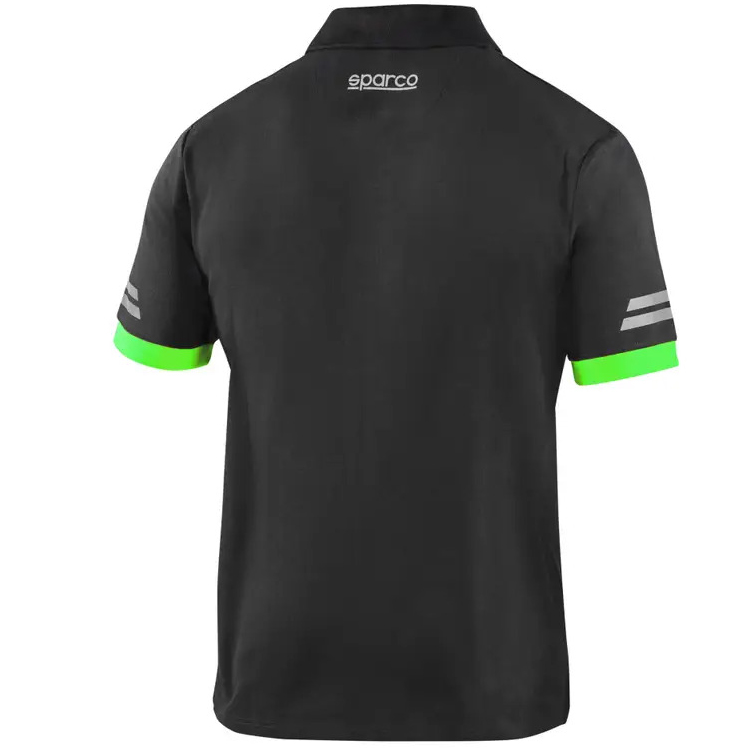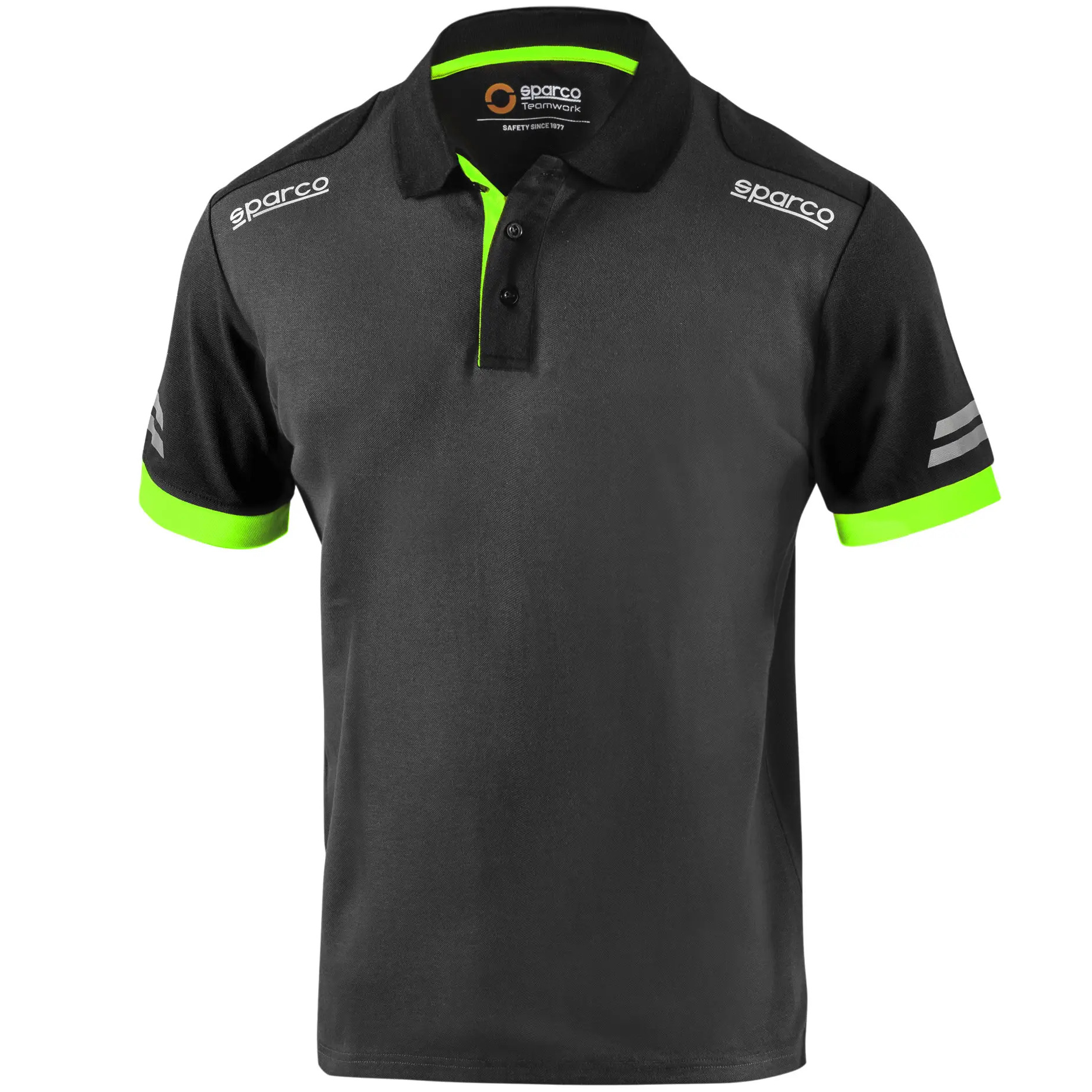 65% bawełna – 35% poliester z efektem pique / 180 g/m2, odblaskowe logo Sparco, pasy o wysokiej widoczności na odblaskowych rękawach, kontrastowe wstawki na rękawach i kołnierzu, wzmocnione ramiona oraz zapięcie przy szyi na 3 guziki, boczne rozcięcia na dole.