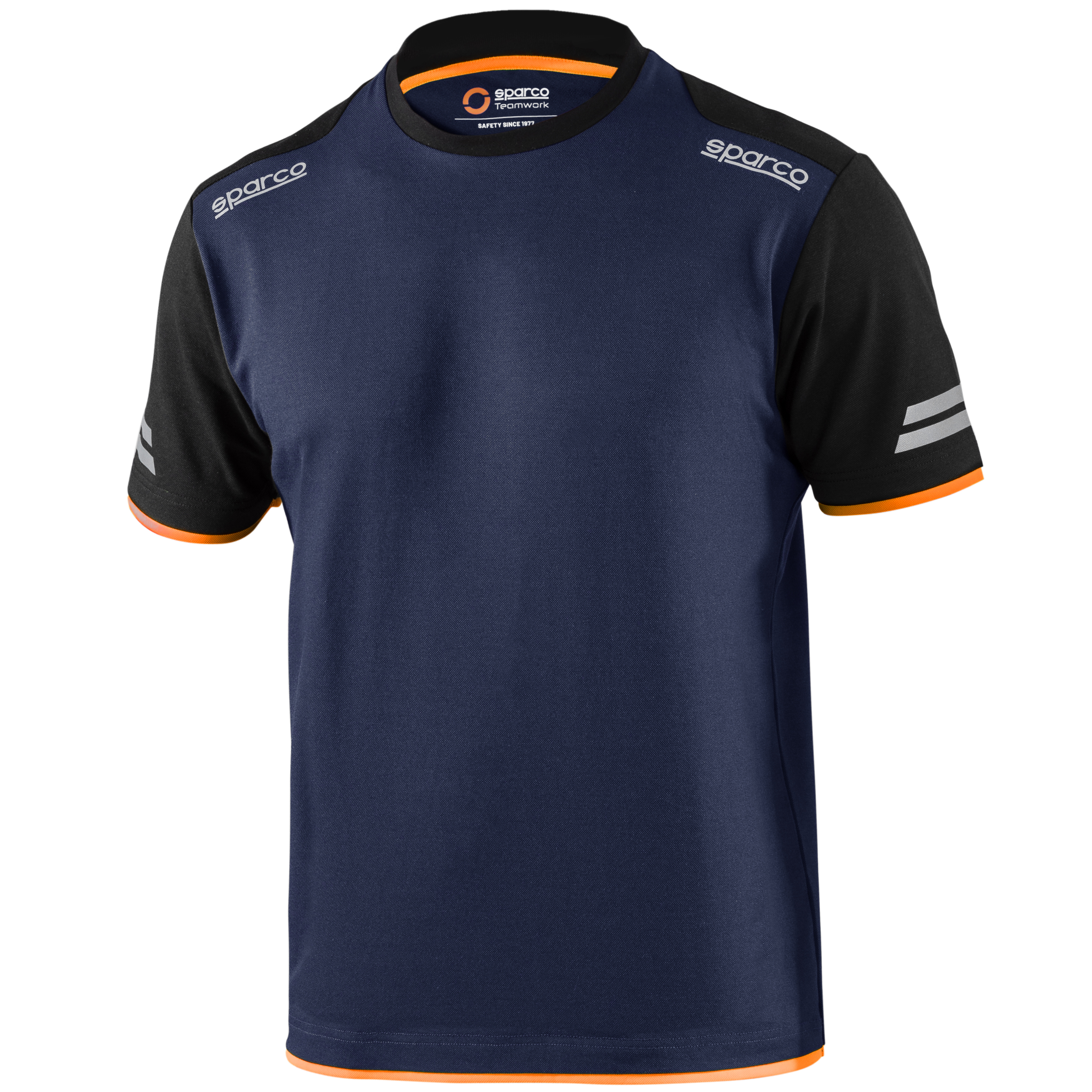 50% bawełna - 50% poliester z efektem piki / 170 g/m2 odblaskowe logo Sparco, dobrze widoczne paski na rękawach, wzmocnienia na ramionach, kontrastowe wstawki.