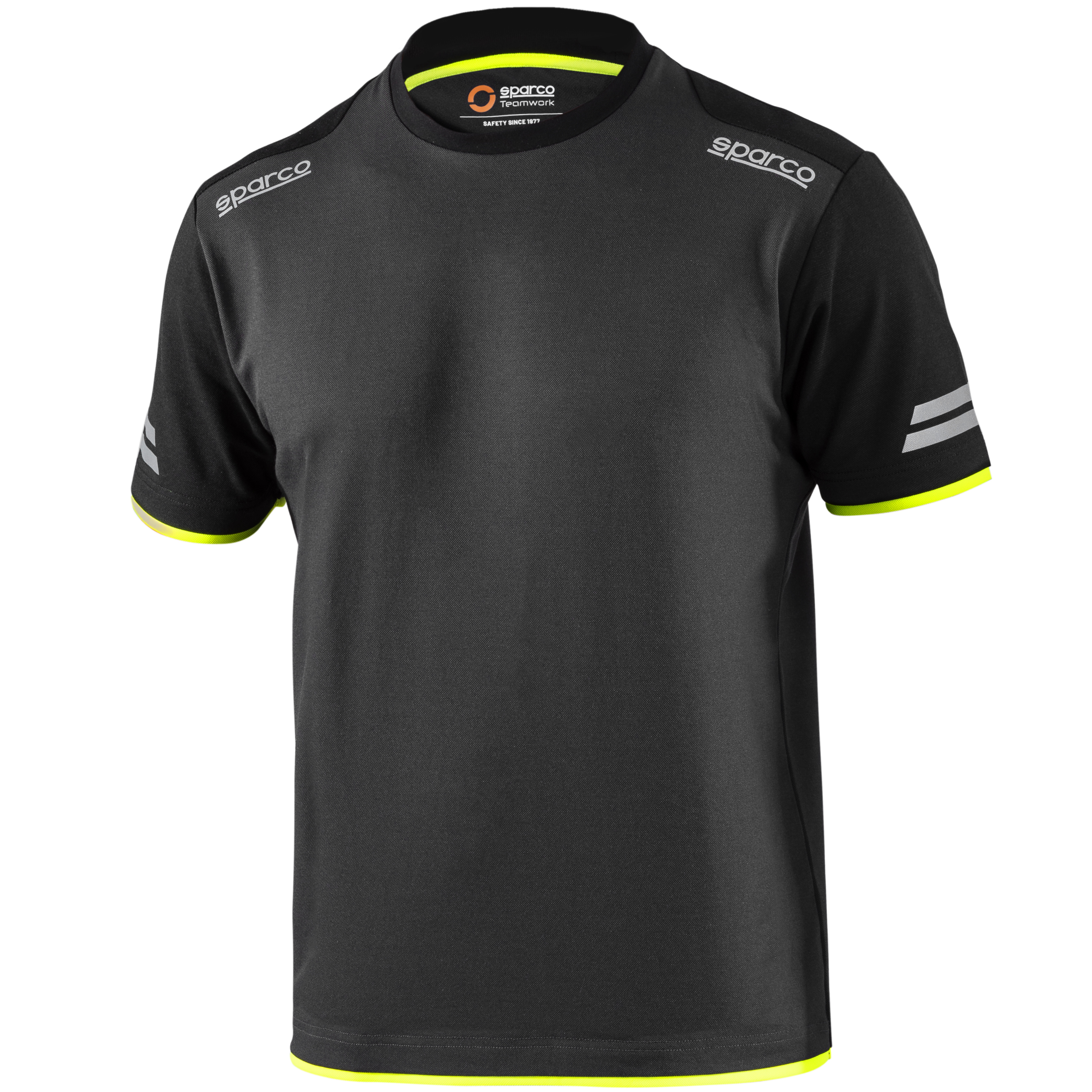 50% bawełna - 50% poliester z efektem piki / 170 g/m2 odblaskowe logo Sparco, dobrze widoczne paski na rękawach, wzmocnienia na ramionach, kontrastowe wstawki.